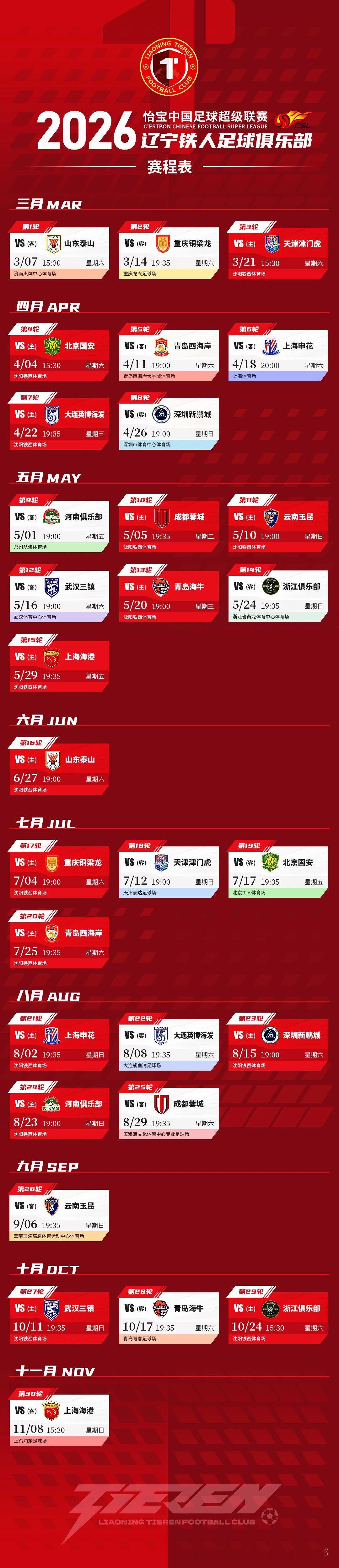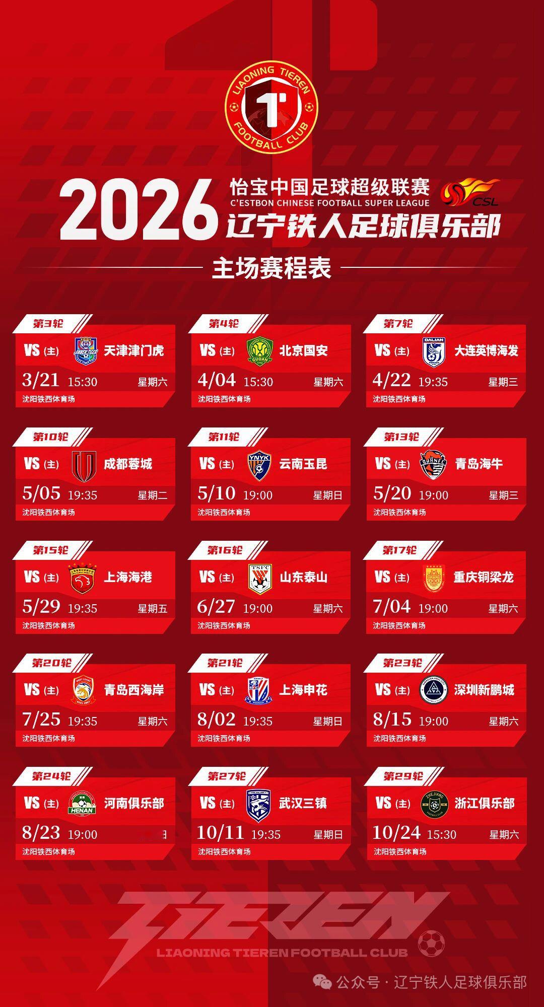 辽宁铁人2026中超赛程表