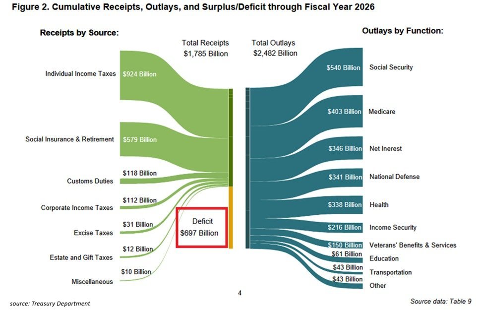 政府收入同比增长 12%,达到 1.8 万亿美元,其中关税收入同比增长 304%,达到 1240 亿美元。