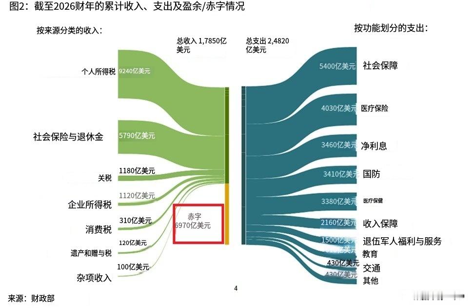 2026 财年的前 4 个月,赤字同比下降 17%,至 6970 亿美元,但仍是历史上第三糟糕的开局。