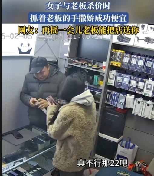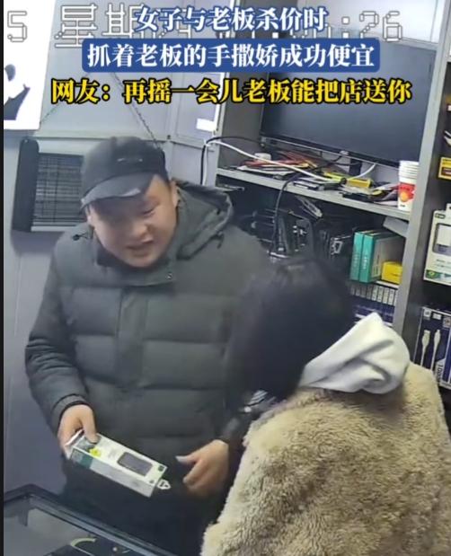 河南,一女子与老板杀价时,抓着老板手一直摇晃,撒娇成功便宜1块钱。 “哎呀,20,不要,20吧。”拉长尾音,掐着声音说话,再加肢体拉扯,依旧没撼动老板的心,女子退让一步“那22吧。” 女子最终以原价23元的前提下,便宜一块钱,就是22元买下充电器。 这招高!证明了,会撒娇的孩子有奶吃。但是女子不撒娇,采用更理性、更有风度的方式进行讲价。比如通过对比市场价格、强调商品的瑕疵或者表达自己的购买诚意等,22也能拿的下来。即使不济,就算23又如何,就贵一块钱就买不起了? 看女子摇摆老板手臂的动作,那娇滴滴的声音,我莫名的反感,这太不值钱了,就为了一块钱丢了自己的尊严与底线。 更重要的是,一点边界感都没有,全然不顾老板及周围人感受。知道你在讨价还价,不知道还以为你在勾引老板。这时候,老板娘闯进来看到,又是另一个故事了。 生活中,讨价还价是很正常的事情,但是方式方法很重要,特别注意一个度。因为砍价而肢体接触,娇娆造作,引起不必要的误会,就过了!
