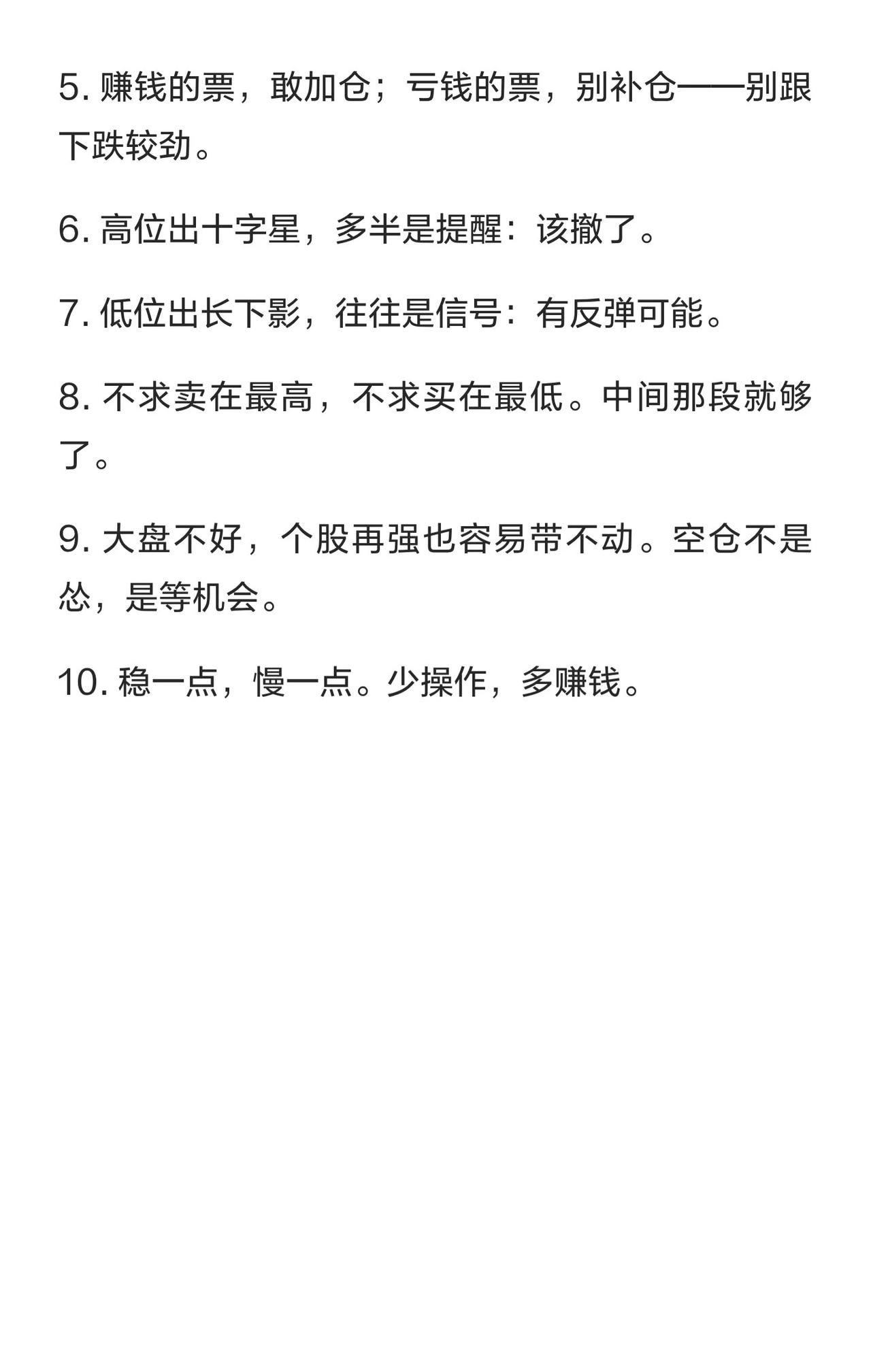 炒股口诀核心总结(共10条) 1. 均线粘合:等方向明确再动,不提前猜测。 2. 底部信号:未见真底不急抄,防假反弹。 3. 强弱股处理:强势股持有,弱势股及时止损。 4. 开盘下跌:别慌割肉,看尾盘走势再定。 5. 加仓原则:盈利股可加仓,亏损股不补仓。 6. 高位警示:高位十字星多为撤退信号。 7. 低位机会:低位长下影常预示反弹。 8. 买卖心态:不追求最高/最低点,中间段即可。 9. 大盘影响:弱市中个股易拖累,空仓是等机会。 10. 操作节奏:稳字当头,少操作多盈利。 核心思想:顺势而为,控制风险,稳扎稳打。