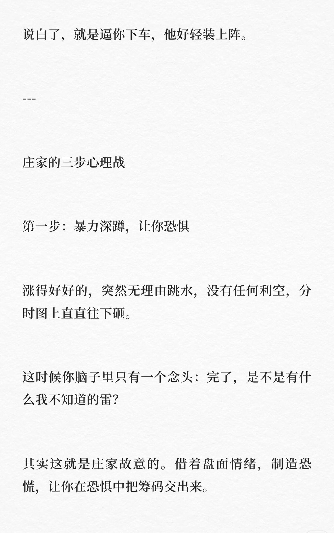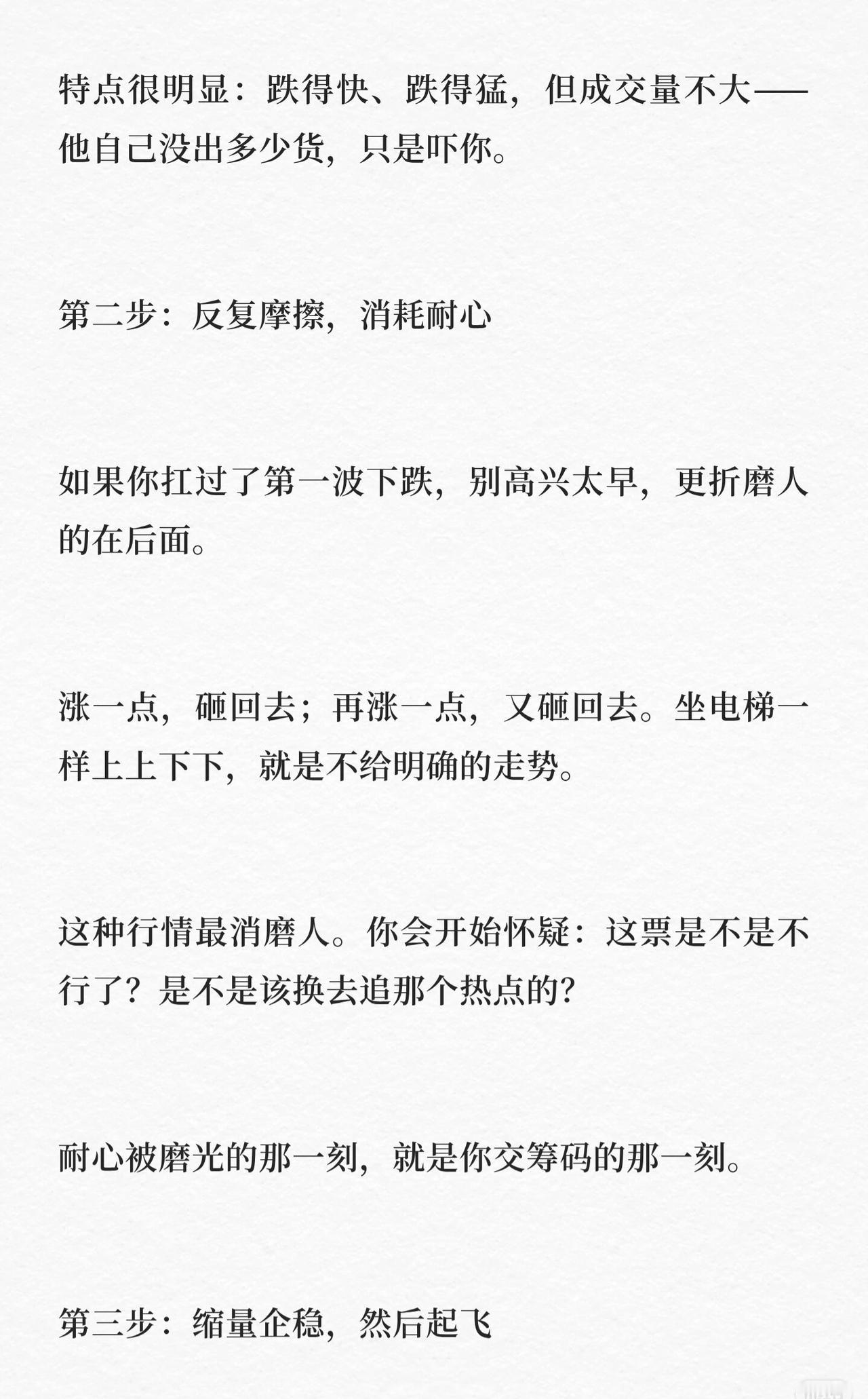 庄家震仓现象及应对策略展开,核心内容如下: 1. 震仓本质:刚卖就暴涨非运气差,是庄家设局震仓,逼投资者下车以便轻装上阵。 2. 庄家三步心理战:①暴力深蹲制造恐慌,让投资者因恐惧交筹码;②反复摩擦消耗耐心,通过震荡使投资者怀疑股票、磨光耐心后交出筹码;③缩量企稳后起飞,此时想卖者已离场,庄家控盘可轻松拉升。 3. 反收割策略:①分清逻辑变(基本面/行业利空)与情绪波动(无实质利空则为情绪博弈);②守住底仓,做差价不丢底仓;③看量不看价,缩量跌多为洗盘,放量跌需警惕出货。 4. 互动:提问读者是否有被震仓洗出的经历,邀请分享。