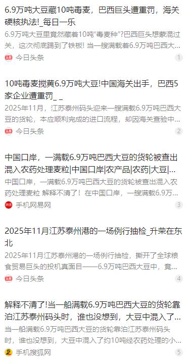 当一船满载6.9万吨巴西大豆的货轮靠泊江苏泰州码头时,谁也没想到,大豆中混入了约10吨经农药处理的小麦,五家涉事巴西企业被中方点名,出口资质遭暂停! 麻烦看官老爷们右上角点击一下“关注”,既方便您进行讨论和分享,又能给您带来不一样的参与感,感谢您的支持! 2025 年 11 月,一艘装载 6.9 万吨巴西大豆的货轮靠泊江苏泰州港,在海关常规查验中,工作人员发现这批大豆中混有约 10 吨异常小麦。 这批小麦并非普通食用粮,而是经过种子专用农药处理的麦种,所含成分属于中国明确禁限用的高毒农药,具有神经毒性,未获得我国食品、饲料准入资质。 这类农药仅允许用于田间播种,严禁流入食品与饲料链条。一旦进入加工环节,会对人体神经系统造成不可逆损伤,长期或大量接触可能引发中毒,严重时危及生命,食品安全风险极高。 海关依托智能检测设备与区块链溯源系统,快速锁定这批小麦的来源,确认问题出在巴西当地的收购、分拣、仓储与装船环节,属于企业质量管控与流程管理的严重疏漏。 经核查,涉事主体共五家巴西粮食企业,包含路易达孚、嘉吉等国际粮商在巴西的关联加工与出口主体,均为具备对华粮食出口资质的企业。 查明事实后,中国海关依规对五家涉事企业暂停对华出口资质,要求其全面整改,排查全链条管理漏洞,整改验收合格前不得恢复对华出口业务。 此次事件并非偶然抽检发现,而是我国口岸依托数字化监管,对进口粮谷实施全流程风险防控的结果,从源头守住国门食品安全底线。 全球粮食贸易企业必须正视中国标准,严格遵守我国食品安全与农产品准入规定,强化供应链全环节质量管控,杜绝混装、漏检、违规夹带等问题。 此次处置既是对违规企业的约束,也是对全球粮商的警示:中国在粮食进口领域坚持安全优先、标准透明,任何试图蒙混过关的行为,都会付出相应代价。