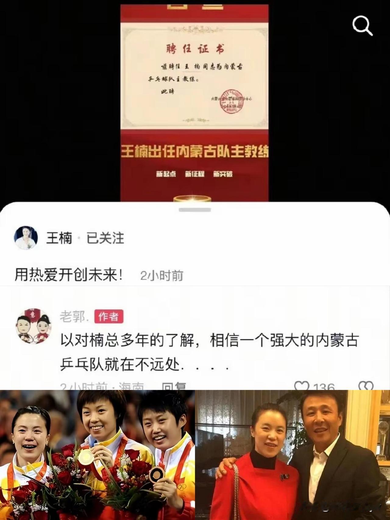 我就纳闷了! 王楠今年48了, 将出任内 蒙 古队主教练? 她出生在辽宁,创业在山东,又要把余热挥洒在内 蒙 古。 王楠职业生涯中 共获得24个世界冠 军,成 为奥 运 会,世乒赛,世 界 杯三大赛女子单打冠 军“大满贯”! 这足以值得她炫耀和回忆的资本。 她有一双可爱的儿女,又有深爱自己的丈夫, 还有自己热爱的乒乓事业, 可谓是家庭事业双丰收! 为什么要撇家舍业去内蒙任教呢? 这就是常人无法想象的: 她要从这片乒乓荒漠里挖掘出未来的世界冠 军! 原来是这样! 王楠演技