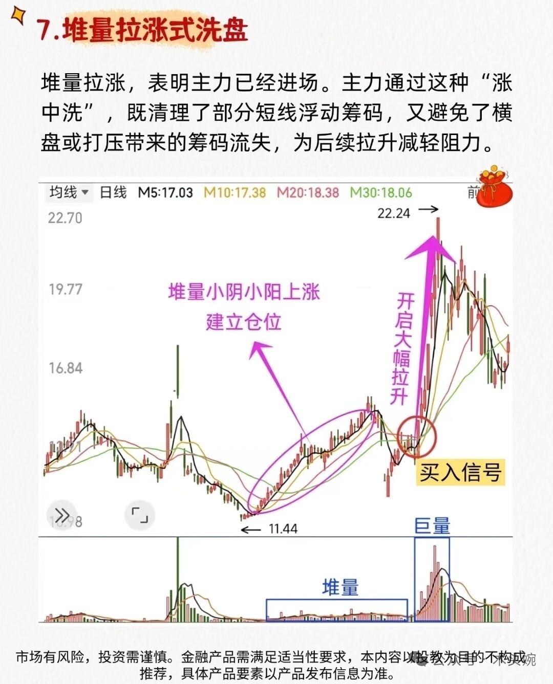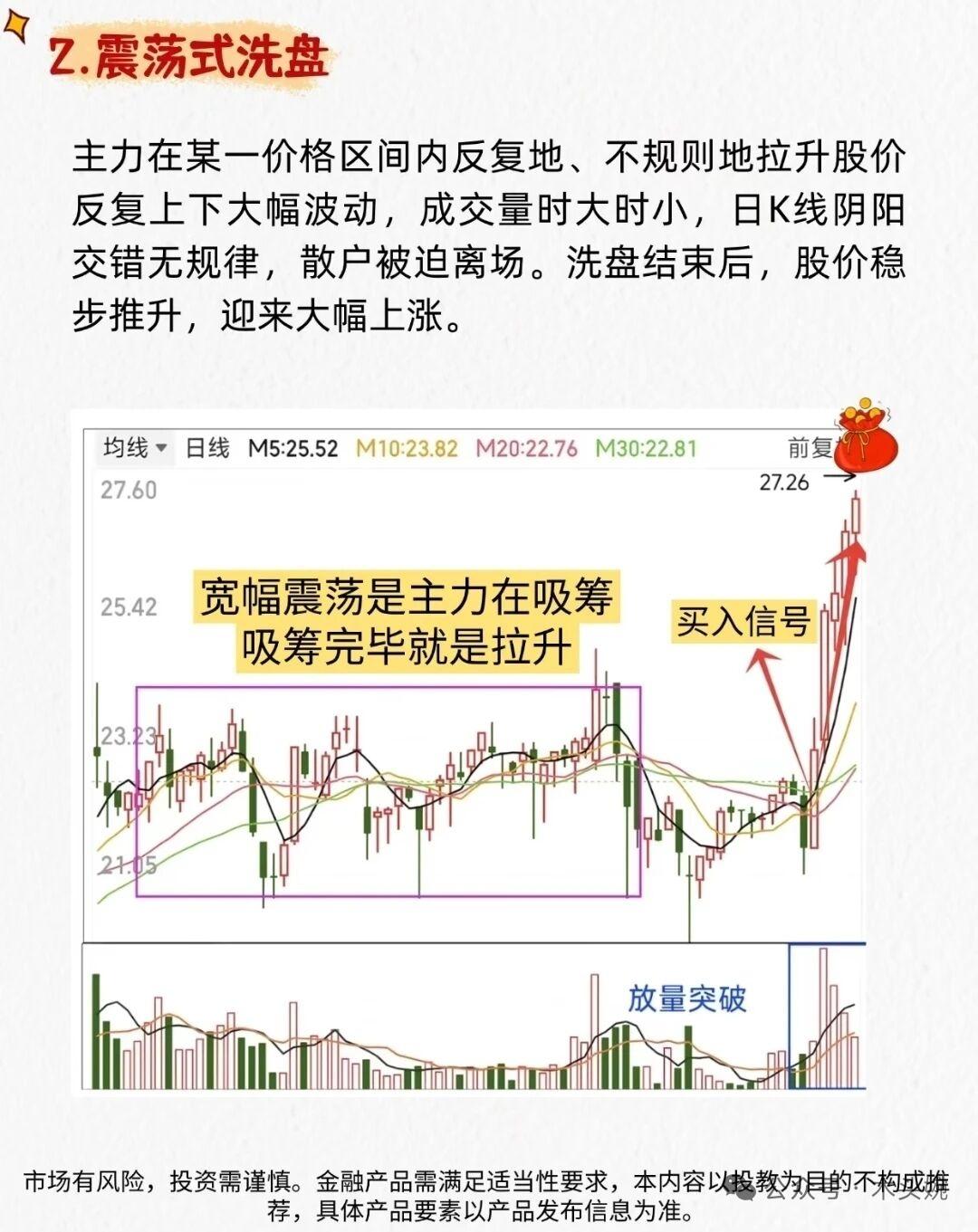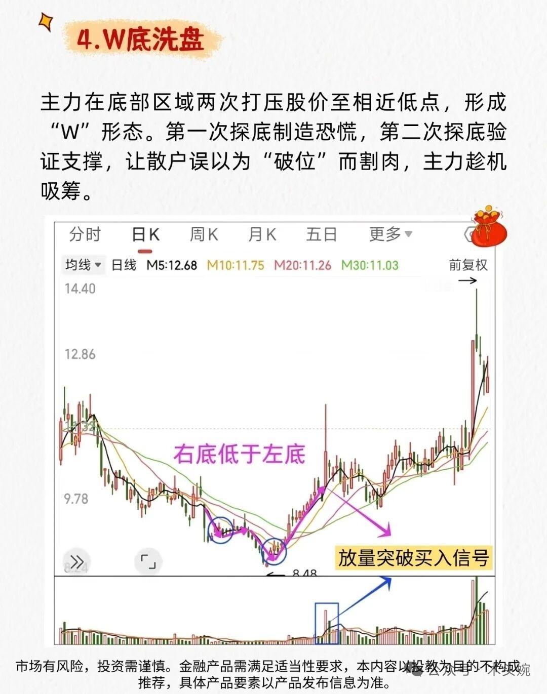 想精准抓住主力洗盘结束的上车点?这7大特征一定要记牢! 主力洗盘结束的信号:多以缩量横盘、宽幅震荡、W底/V底等形态出现,不破关键支撑、量能温和企稳,放量突破时多为主升浪启动点,入场需带好止损。市场有风险,投资需谨慎。历史规律不代表未来,决策需独立判断。 平台式洗盘:主力在底部长期震荡吸筹,随后小幅拉高后横盘整理,逼散户交出筹码。 边拉边洗式洗盘:主力在股价上涨途中穿插小幅回调,既清洗获利浮筹,又吸引新资金入场。 缩量突破式洗盘:突破前缩量,突破时放量,这才是真突破,可果断跟进…… ​ ⚠️ 市场有风险,投资需谨慎。资料取材网络仅供参考,不能完全照搬套用。
