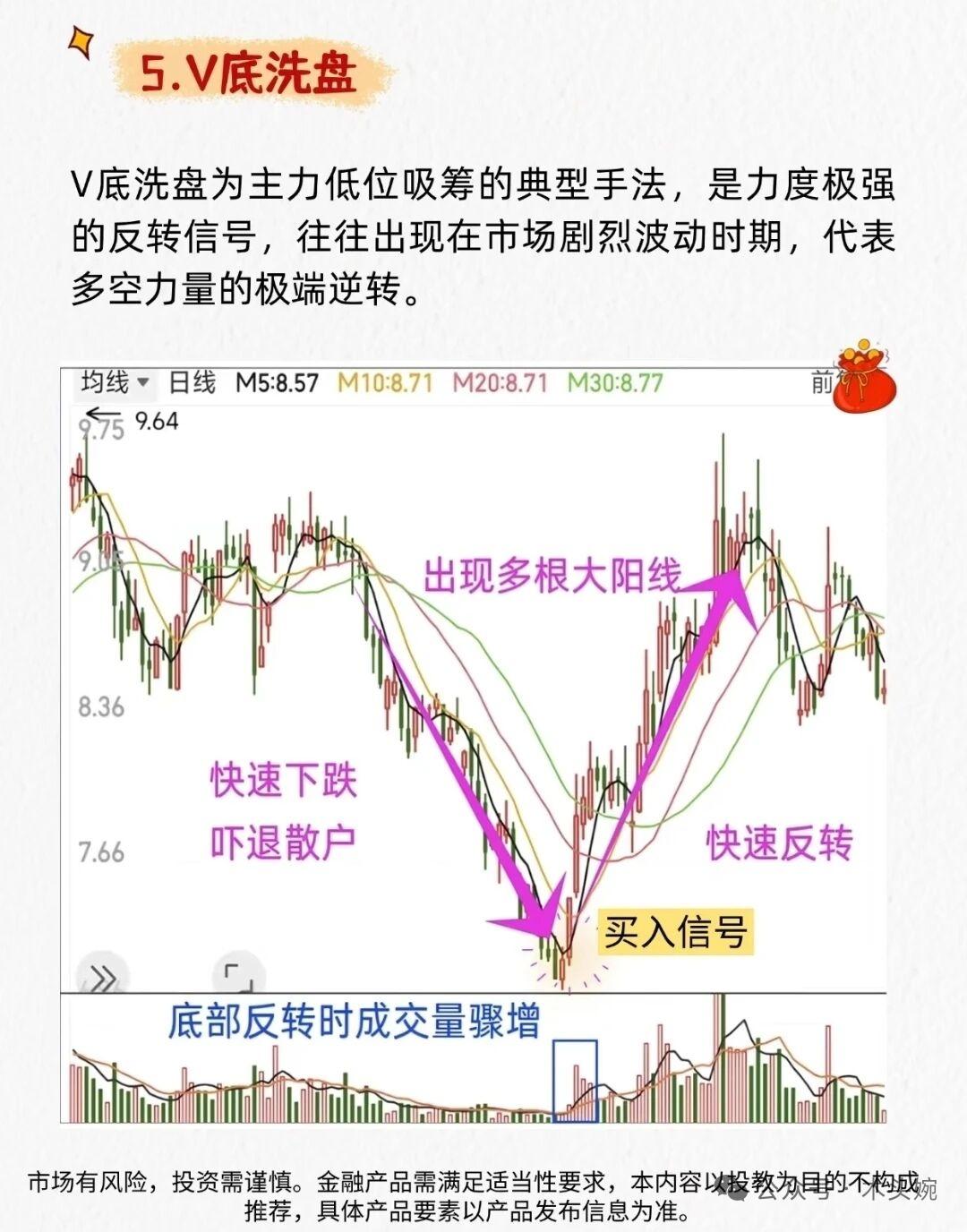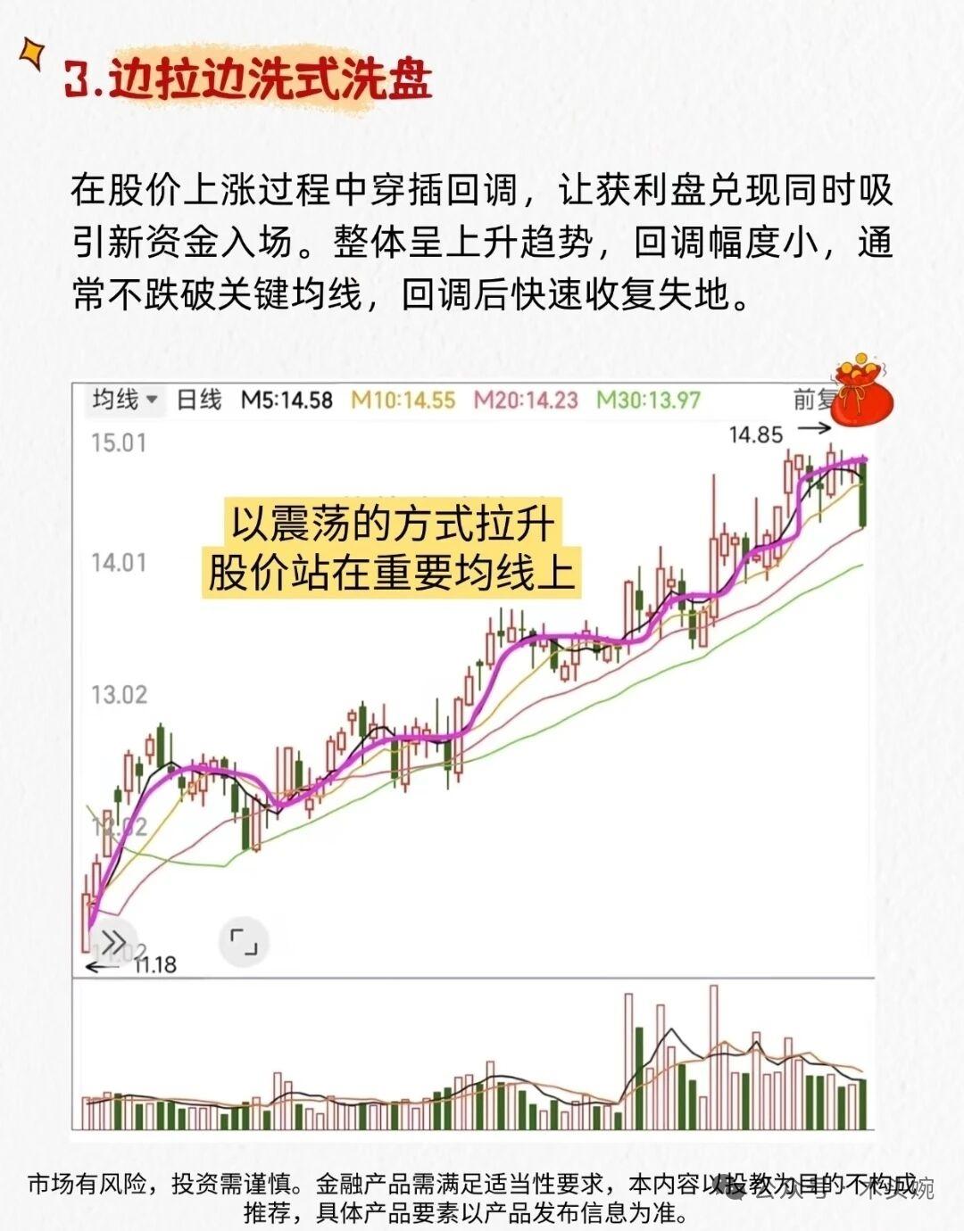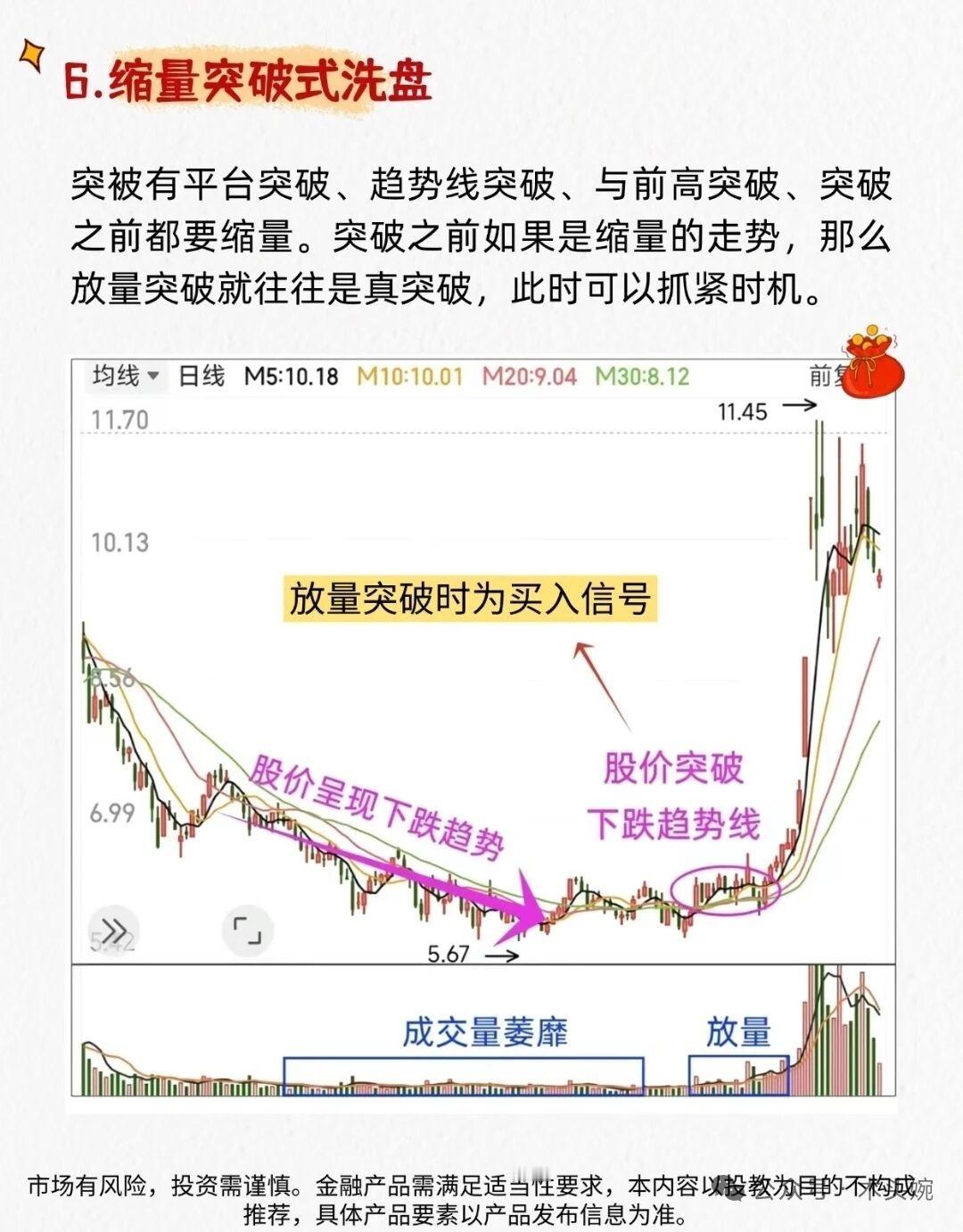 想精准抓住主力洗盘结束的上车点?这7大特征一定要记牢! 主力洗盘结束的信号:多以缩量横盘、宽幅震荡、W底/V底等形态出现,不破关键支撑、量能温和企稳,放量突破时多为主升浪启动点,入场需带好止损。市场有风险,投资需谨慎。历史规律不代表未来,决策需独立判断。 平台式洗盘:主力在底部长期震荡吸筹,随后小幅拉高后横盘整理,逼散户交出筹码。 边拉边洗式洗盘:主力在股价上涨途中穿插小幅回调,既清洗获利浮筹,又吸引新资金入场。 缩量突破式洗盘:突破前缩量,突破时放量,这才是真突破,可果断跟进…… ​ ⚠️ 市场有风险,投资需谨慎。资料取材网络仅供参考,不能完全照搬套用。