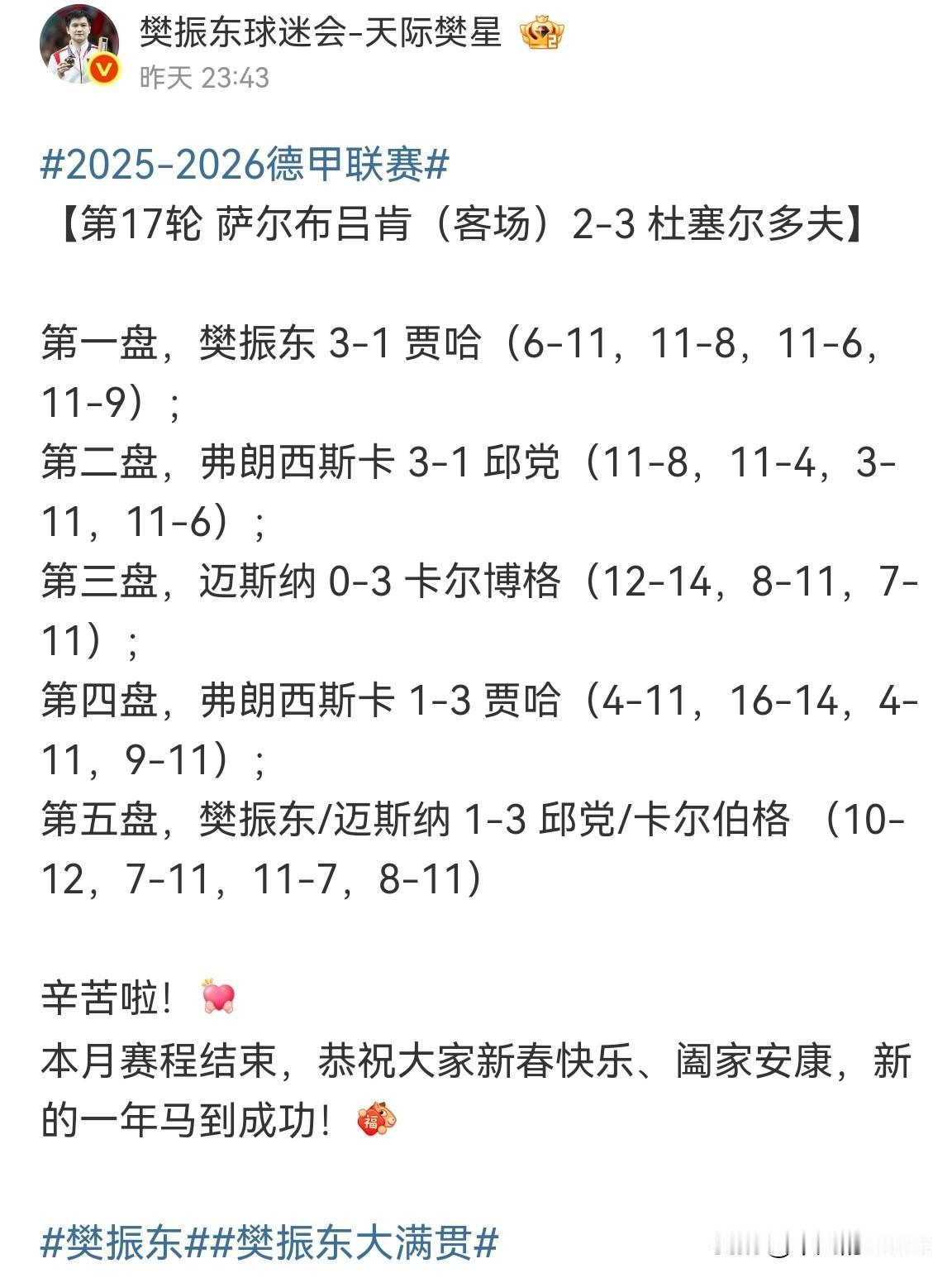 2月16日,小弗队长更新动态,并配文“Team! We keep going”。 德甲第十七轮比赛中,小弗队长和樊振东的出战成绩都是“一胜一负”。 第五局比赛时,樊振东/迈斯纳以积分1-3输给了邱党/卡尔伯格,这应该是东东到德国打球后的第一场双打比赛吧。 最终,萨尔布吕肯以2-3输给了杜塞尔多夫。 小弗队长发了3张照片,2张队友合照,1张单人照。 萨尔布吕肯队身穿中国红专属战袍登场,特别的喜庆,我还是第一次看东东穿红色衣服。 今天就是除夕夜了,东东能回广东过年吗?