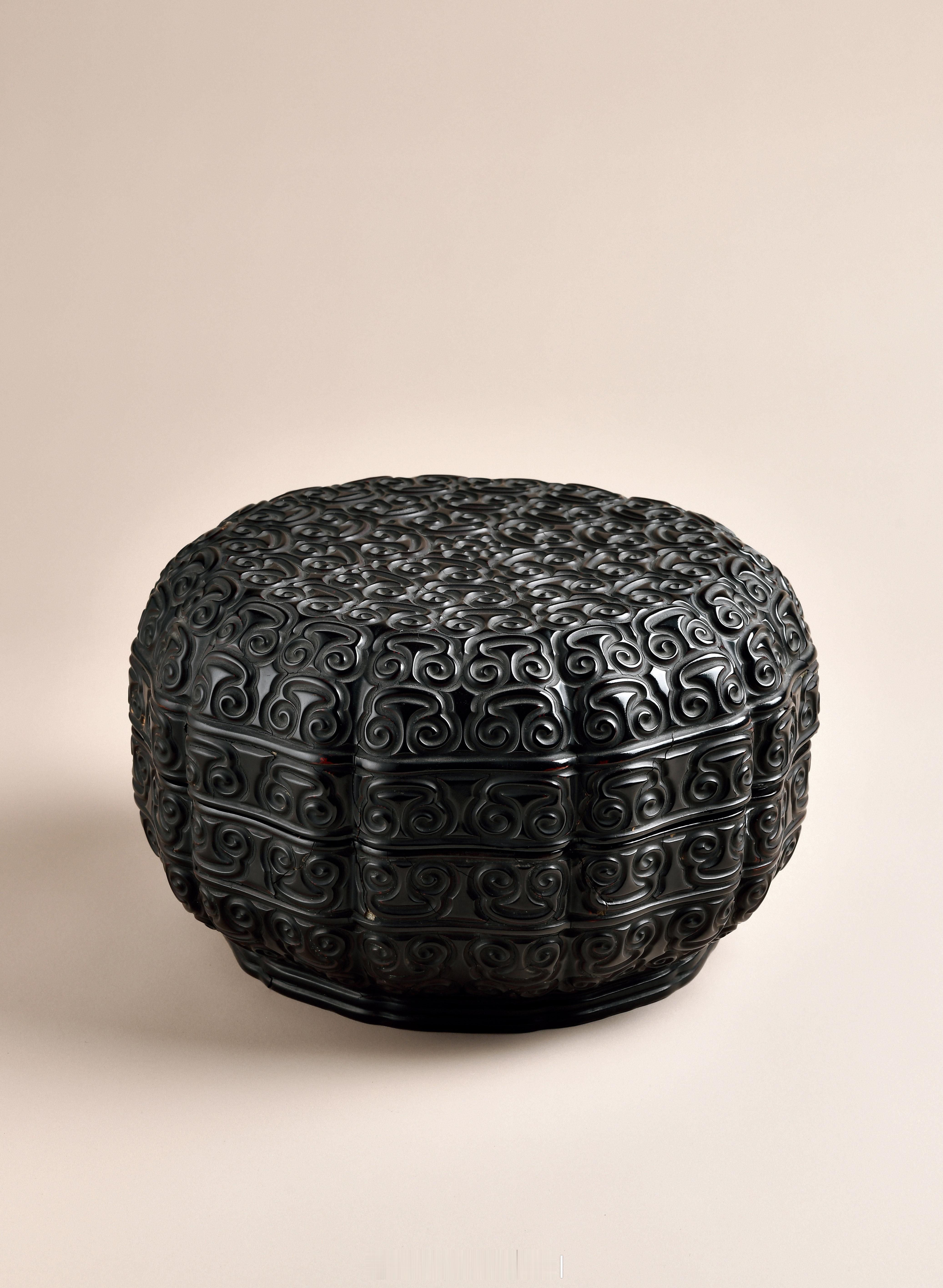 器作扁盒状,整体由盒盖及盒身两部分组成。其以木为胎复经髹饰黑色大漆复经剔刻而成,盖身口缘间设有企口可盖合。捧盒高身宽体,体型甚大,整器髹饰黑色大漆,漆层肥厚,复以剔刻手法深镌如意云头纹布满器身。颇具明代剔犀时代装饰风格特点。下承圆形直壁矮圈足。足内底平整如镜。整器堆漆丰厚,剔刻深峻,打磨圆熟光洁,具有明代剔犀代表性工艺特点。其品相完整,包浆丰厚润泽,令人观之难以割舍。