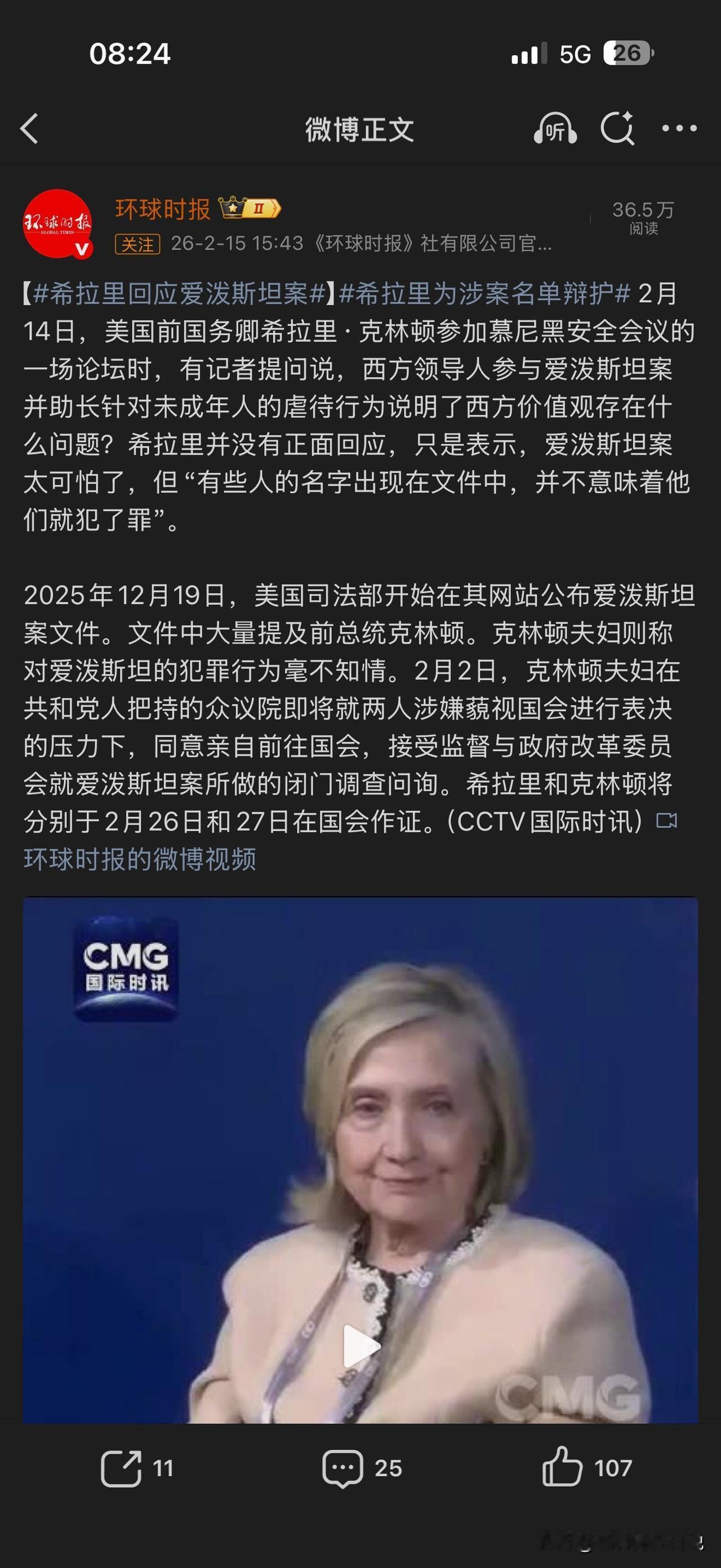 原本外国政客说的任何一句话我都是不信的,但是这次我却相信了希拉里的一句话,那就是“爱泼斯坦案太可怕了”,其它的我就连一个标点符号就不信了!这句话是她在2月14日参加慕安会时,回答西方记者问题时说的。至于后面他说的“有些人的名字出现在文件中,并不意味着他们就犯了罪”。好吧,这位大佬可能不知道人以类聚、物以群分的道理。举个例子吧,一个恶贯满盈的江阳大道,经常邀请我去他家各种聚会,各种嗨皮,然后我坚称这个江洋大盗实在是太可怕了,但我其实清白如雪,我只是去和他谈理想、聊人生,记录我的2026