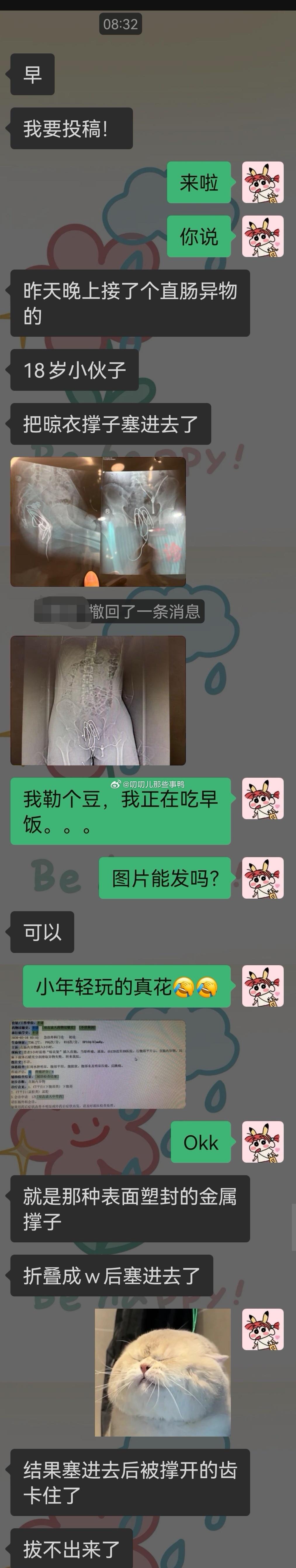 投稿:接了个直肠异物的,18岁小伙子,把晾衣撑子塞进去了。。。