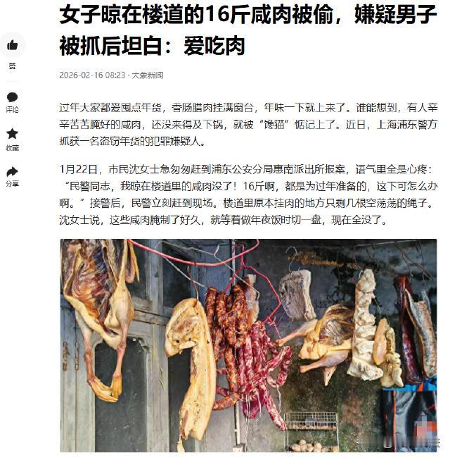 上海,沈女士腌了16斤咸肉晾在楼道,就等着年夜饭时和家人一起品尝。可等她去查看时,发现咸肉竟全没了,一块都没留,这可把她气坏了,立马报了警,民警很快锁定小偷是惯偷徐某,他路过闻到香味,看到肥瘦相间的咸肉就起了贼心,顺手全偷走了。16斤咸肉虽值200元左右,但徐某的行为已构成盗窃。 离过年就剩半个月了,沈女士把自己腌了大半个月的16斤咸肉,串在绳子上晾在楼道通风。 本来就等着除夕夜切一盘,一家人边吃边聊,结果某天下午去看,绳子上空空如也,一块肉都没剩下,她当场气得手都抖了,转头就跑去报了案。 说实话,这咸肉来得真不容易。 沈女士前前后后忙了快一个月,选肉、清洗、抹盐、腌制,每天都要翻一遍,就怕坏了。 晾在楼道也是没办法,家里阳台晒不到太阳,想着楼道通风好,而且都是邻居,应该没人会拿。 谁能想到,就这么几天功夫,16斤肉全没了。 沈女士跟民警说的时候,声音都带着委屈,这哪是偷肉,这是把她的年味给偷走了。 民警也挺理解的,老百姓过年的盼头被人这么糟践,换谁都上火。 当即就去楼道查了,看了监控,走访了附近邻居。 监控里很快就锁定了一个男的,大概四十多岁,穿着件深色外套,路过沈女士家楼道时,脚步明显停了。 先是抬头闻了闻,然后左右看了看没人,直接伸手把一串咸肉拽下来,塞进随身的袋子里。 本来以为他拿一串就走,没想到他干脆把所有肉都解下来,扛着袋子就溜了。 民警顺着监控一路追,没过几天就查到了这男的住址,姓徐,是个惯偷。 抓到徐某的时候,他还挺坦然,说自己就是爱吃肉,路过闻到香味没忍住。 说实话,这话听着更气人。 你爱吃肉不会自己买吗?别人辛辛苦苦做的年货,你说拿就拿,也太不把别人的劳动当回事了。 徐某交代,他以前就因为盗窃被处理过好几次,这次看到楼道里的咸肉,觉得不值钱,就算被发现也没事。 可他没想到,就这200块钱左右的咸肉,照样让他栽了。 其实这里有个点很多人可能不知道,不是说偷的东西便宜就没事。 沈女士后来也问过,说这肉才200块钱,能不能立案? 民警跟她说,能立,而且徐某这情况,已经构成盗窃罪了。 那么,法律上该怎么认定这事呢? 根据《刑法》第二百六十四条明确说了,盗窃公私财物,数额较大的,或者多次盗窃、入户盗窃的,都算盗窃罪。 上海这边的标准是,一般偷2000块以上算 “数额较大”,但如果是多次盗窃,不管金额多少,都能立案。 徐某有多次盗窃前科,这次又偷咸肉,已经符合 “多次盗窃” 的条件了。 有人会说,不就几块肉吗?至于判刑吗? 其实,挺至于的。小偷小摸看似事小,但次数多了,就说明这人根本没把法律当回事。 而且沈女士的咸肉,不只是 200 块钱的东西,那是她为过年准备的心意,是一种情感寄托。徐某偷走的不只是肉,还有别人对过年的期盼。 沈女士把咸肉晾在楼道,算不算占用公共空间? 《民法典》里说,业主不能侵占楼道这些公共通道。 沈女士这么做确实有点不妥,楼道是大家共用的地方,晾肉可能会影响邻居通行,还可能有异味。 但这绝对不是徐某可以盗窃的理由,不能说别人有小过错,你就可以干违法的事,这逻辑说不通。 就算沈女士占用了公共空间,该管的是物业或者居委会,轮不到徐某来 “顺手牵羊”。 现在徐某已经被警方采取刑事强制措施了,等待他的肯定是法律的制裁。 至于沈女士的损失,徐某也没能力赔偿,毕竟他本身就没什么收入,偷来的咸肉早就被他吃了。 想想也挺无奈的,沈女士忙活了一个月,最后啥也没捞着,还惹了一肚子气。 过年囤年货,尽量别放在公共区域,不管是楼道还是阳台外,都容易被惦记。 尤其是腊肉、香肠这些年味重的东西,香味飘得远,很容易吸引小偷。 另外,也别觉得小偷小摸没关系,多次盗窃不管金额多少,都可能构成犯罪。 还有就是,公共空间是大家的,别随便占用,既影响邻居,也可能给自己带来麻烦。 过年嘛,图的就是个热闹和舒心,忙活半天的年货被人偷走,换谁都生气。 而徐某有手有脚,偏偏要走歪路,一次次盗窃,最后把自己送进去,真的不值得。 大家觉得,徐某偷200块的咸肉被立案,冤不冤? 如果是你,会把年货晾在楼道吗?遇到这种事,你会怎么处理?欢迎在评论区聊聊你的看法。