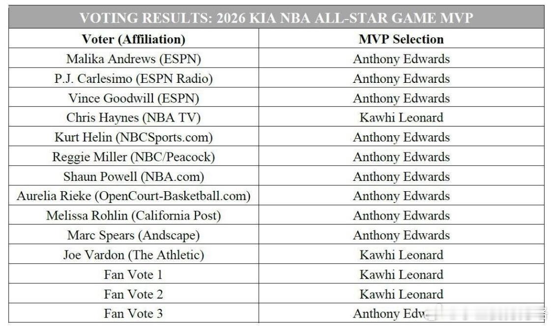 全明星 MVP投票结果:爱德华兹获得10票,伦纳德获得4票