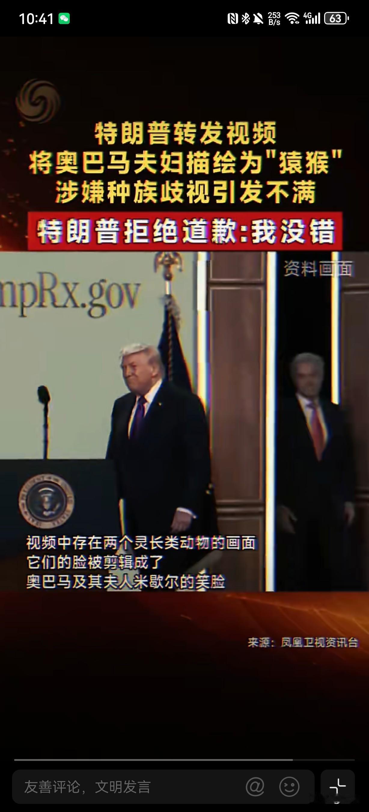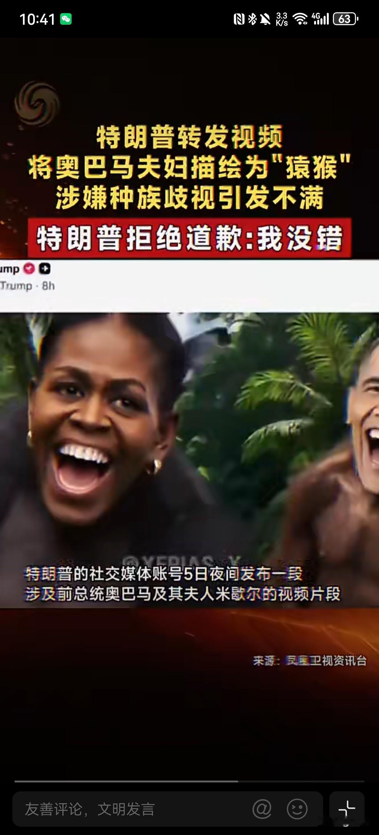 特朗普把奥巴马夫妇P成猿猴,白宫拖10小时才删!奥巴马怒了:廉耻心已荡然无存。 特朗普发布AI恶搞视频,将奥巴马夫妇的脸P到猿猴身上,配《狮子王》音乐,公然触碰种族歧视红线。白宫在舆论爆炸下拖延10小时才删除,还甩锅“工作人员误发”,这套说辞没人相信。 2月14日,奥巴马终于首次回应,全程未点名却句句扎心: - 美国公职人员的廉耻心和教养,已经荡然无存 - 政治论述堕落到残忍不堪、前所未见 - 多数美国人对此深感不安 - 最终答案,在选民手里 这早已不是玩笑,而是政治伦理的底线测试。特朗普重返白宫后,AI造假攻击政敌已成常态,“奥巴马被捕”、丑化非裔议员……一次比一次无底线。 更可悲的是:发的人不以为耻,删的人迫于压力,看的人日渐麻木。 廉耻没了、教养没了,最可怕的是——没了这些,居然还能赢选票。美国政治正在彻底沉沦。