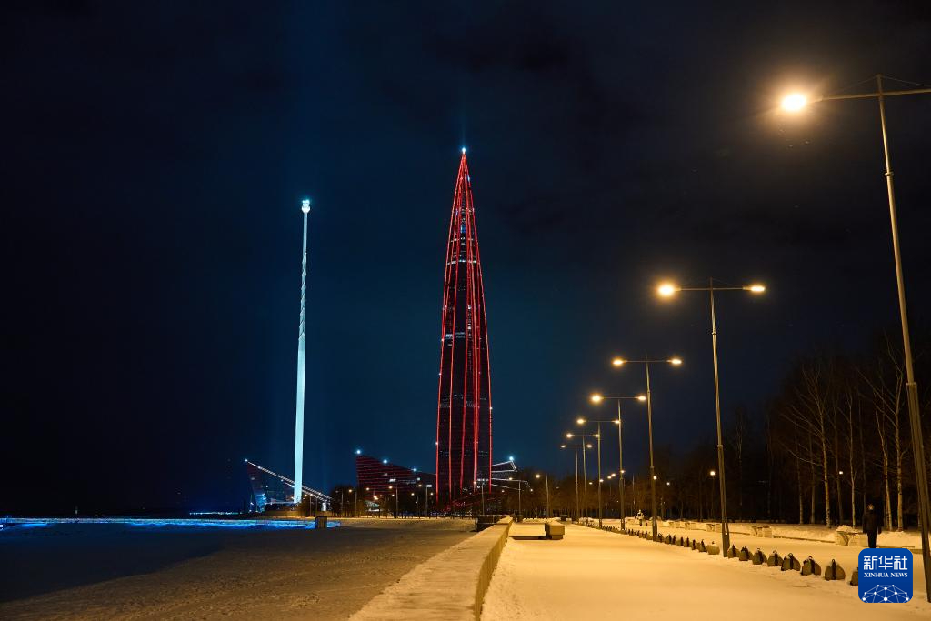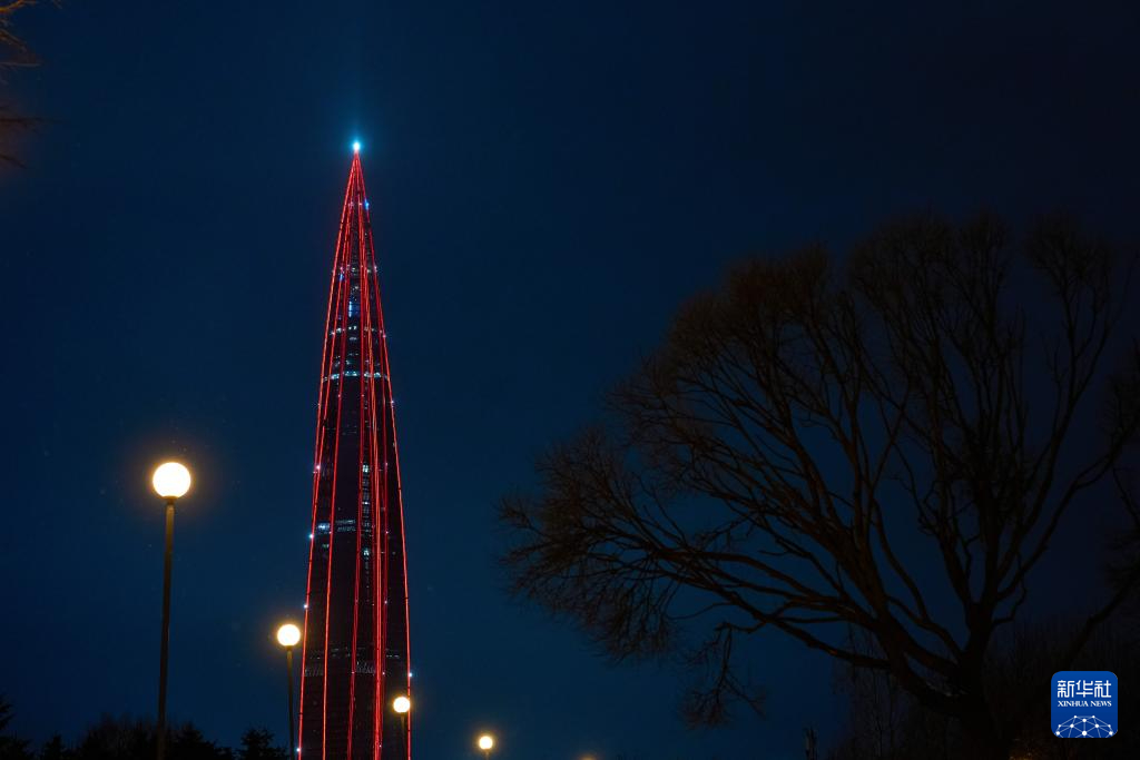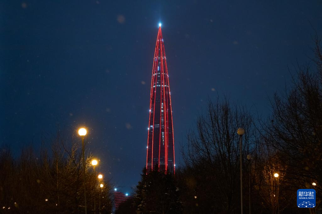 #俄最高建筑点亮中国红庆祝马年春节#【俄罗斯最高建筑点亮“中国红”庆祝马年春节】2月15日,俄罗斯最高建筑拉赫塔中心点亮“中国红”,庆祝马年春节。(新华社)#除夕#