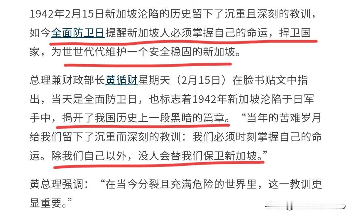 新加坡对日本的态度变了!去年11月份时,黄循财还声称,东南亚已把历史放在一边、与日本和解,希望中国也搁置历史、向前看。没想到仅仅过了不到四个月,黄循财有了新说法。2月15日,黄循财表示,1942年2月15日新加坡沦陷的历史留下了沉重且深刻的教训,如今全面防卫日提醒新加坡人必须掌握自己的命运,捍卫国家,为世世代代维护一个安全稳固的新加坡。 1942年,新加坡沦陷于日军手中,揭开了我国历史上一段黑暗的篇章。当年的苦难岁月给我们留下了沉重而深刻的教训:我们必须时刻掌握自己的命运。除我们自己以外,没人会替我们保卫新加坡。很显然,此前黄循财还声称东南亚已把历史放在一边、与日本和解了,也希望中国搁置历史,但是现在的新加坡却回忆起了历史,并表示这是最黑暗的篇章。 说实话,这种论调可不像是已经和解的论调,这分明有对日本的担忧。新加坡前后态度转变这么大,这说明什么呢?这恰恰说明,新加坡比谁都清楚,历史从来不是说放下就能放下的。去年的讲话,本质上就是为了讨好美国、示好日本,在大国之间刷存在感。而现在强调“没人会替我们保卫新加坡”,这说明新加坡自己很清楚,日本的动向很危险。 作为小国,新加坡就是在各大国之间平衡周旋。当然,新加坡没有资格要求我们放下历史。新加坡不敢得罪美国和日本,劝我们大度,本质上就是新加坡的利益精算。但如果日本真要是扩军经武,新加坡就真的愿意看见吗?这恐怕是未必。要和解,就需要彻彻底底的与过去切割,彻彻底底的走和平主义国家道路。新加坡对日本流露出担忧,其它东南亚国家何尝没有担忧呢?