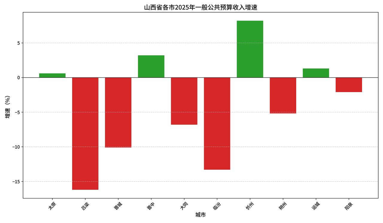 刚刚看到山西省2025年各市财政收入,整体表现有压力,个别城市表现亮眼。 山西经济排名 山西2025年财政成绩单出炉:太原稳增,吕梁、晋城大幅下滑,忻州增速亮眼! 2025年山西省各市一般公共预算收入数据出炉,整体呈现“一稳多降、亮点突出”的格局。 全省一般公共预算收入为3218.6亿元,较2024年的3541.7亿元减少323.1亿元,同比下降9.10%,整体承压。 各市表现: 太原市:以443.07亿元稳居榜首,增量2.81亿元,增速0.60%,在全省下滑的大背景下实现了正增长,展现出省会城市的经济韧性。 吕梁市:从2024年的332.24亿元降至278.3亿元,增量-53.94亿元,增速-16.20%,降幅全省最大,财政收入缩水明显。 晋城市:收入230.6亿元,同比下降10.10%,增量-26亿元,财政压力同样不小。 忻州市:成为最大亮点,收入148.2亿元,增量11.2亿元,增速高达8.20%,在全省中一枝独秀。 晋中市、运城市:也实现了小幅正增长,分别为3.20%和1.30%。 从数据看,山西财政整体面临转型阵痛,尤其是资源型城市受大宗商品价格波动影响较大。而忻州等城市的逆势增长,也为全省经济结构调整提供了新的思路。 大家怎么看待山西省2025年各市财政收入表现情况的呢?欢迎评论[呲牙] 注:长治市目前暂未公布2025年财政收入数据 山西城市排行 吕梁 忻州 太原