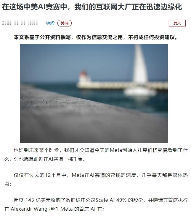 2025年8月的一篇文章观点是《在这场中美AI竞赛中,我们的互联网大厂正在迅速边缘化》,关注的就是投资额。美国4家科技巨头过去5年资本开支之和5.36万亿人民币,中国7家头部公司(腾讯,阿里,百度,京东,快手,美团,网易)仅为6300亿人民币。美国拿钱砸,中国砸不动,所以要边缘化了。那时舆论是这个风向。