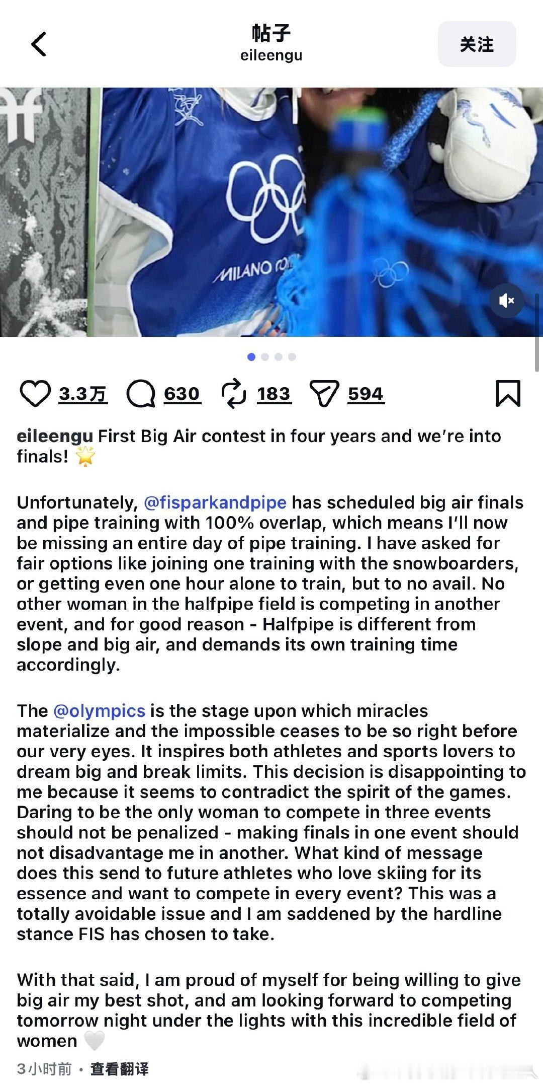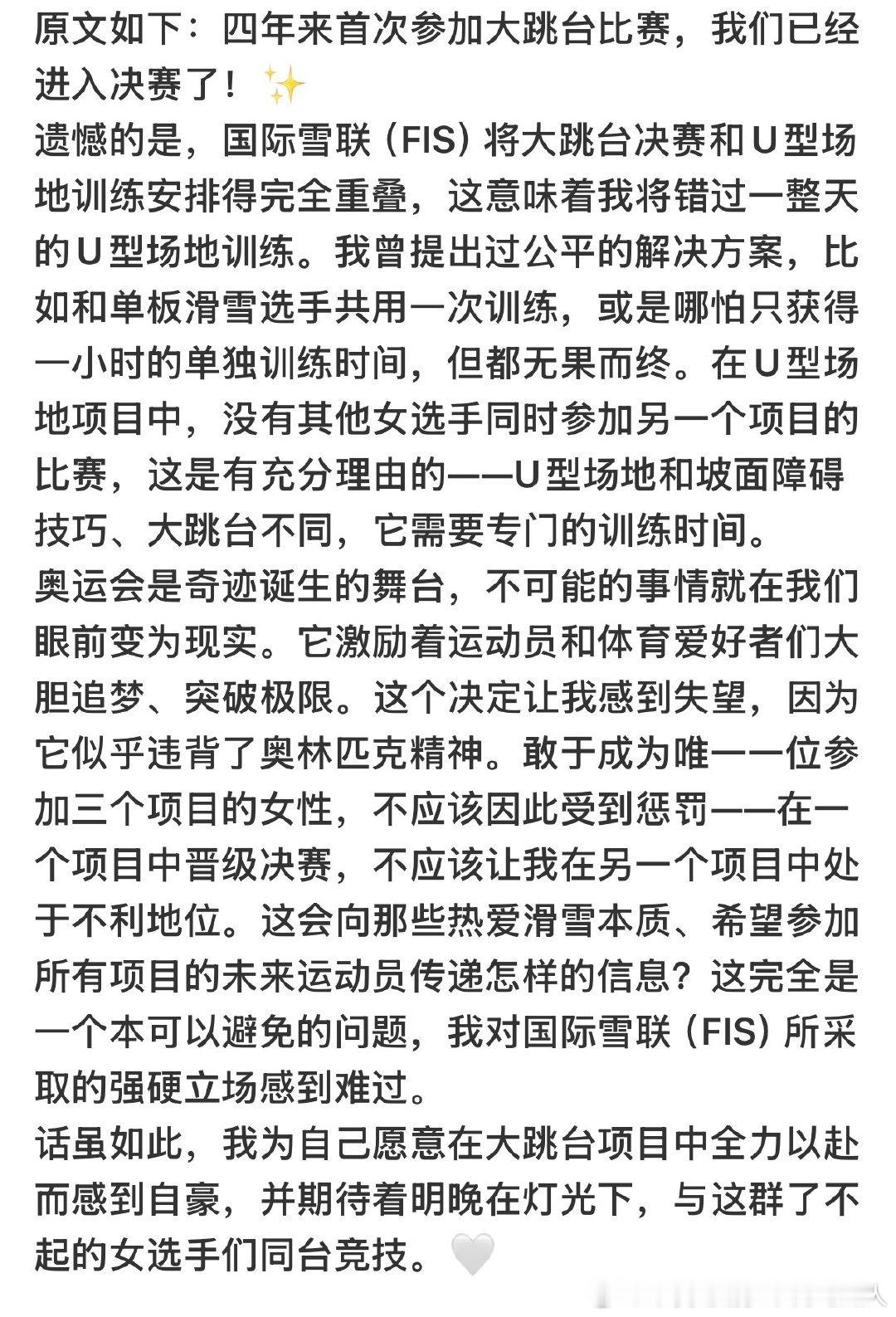 挺佩服谷爱凌的,兼三项还有时间写小作文吐槽国际雪联,艾特奥组委。但她说的没错啊!赛事安排不合理,和训练适应场地时间冲突,凭什么能力强,比的越多,赛前训练还要少1/3。现在吐槽国际雪联挺好,人家官方都对她冷嘲热讽了,打分也是故意恶心她,让你银就差一点点那种。在哪里都要会闹,太过体面没好处。