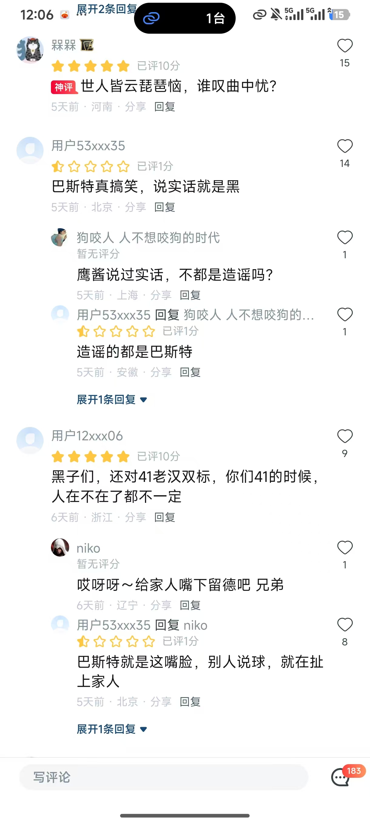 用户53xxx35(已评1分,5天前,安徽) “造谣的都是巴斯特”