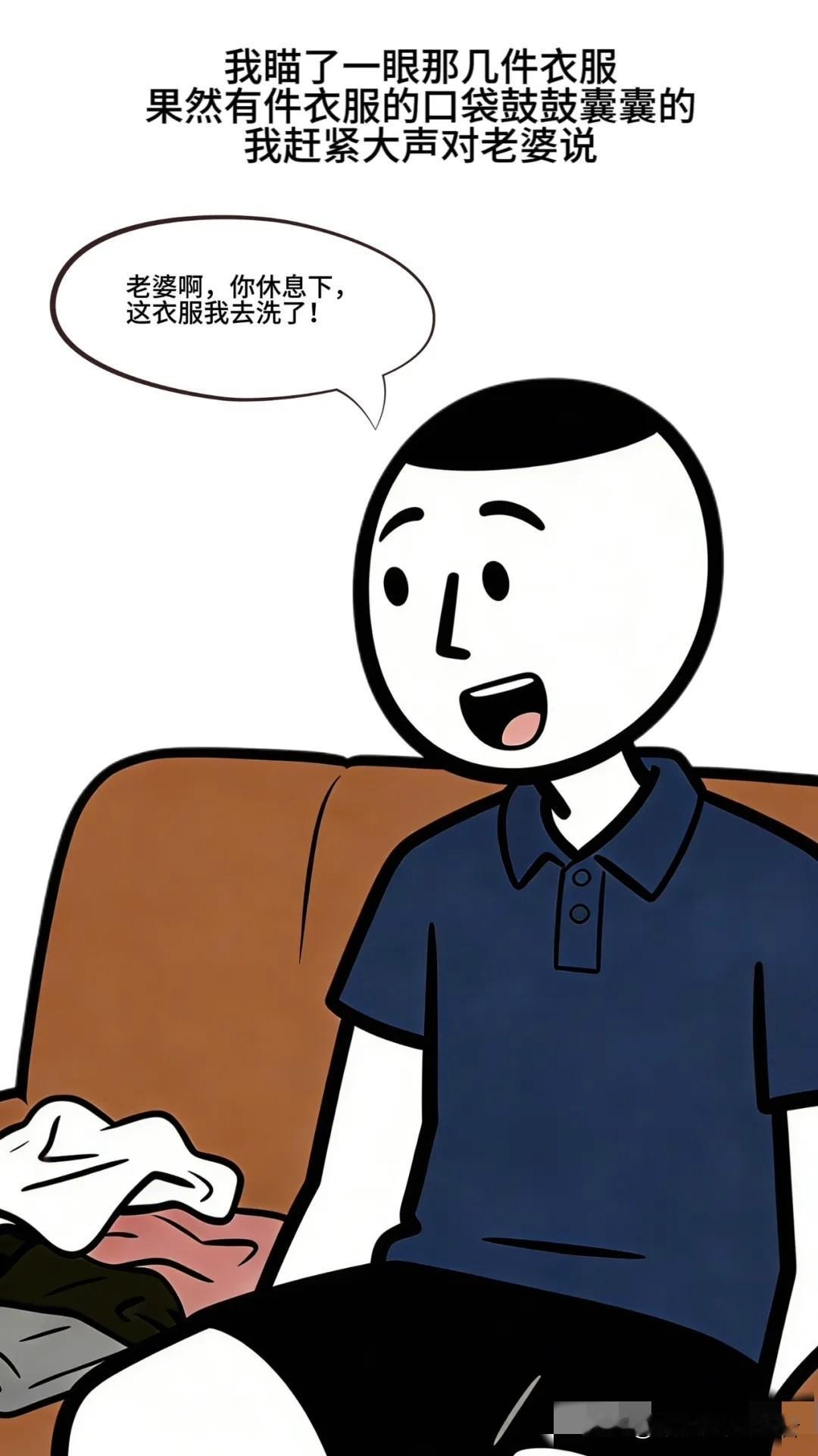 逗你笑:老婆让我洗衣服,我正准备找借口,听见媳妇边找东西边嘀咕:咦,我的钱哪去了?我瞄了一眼脏衣服,赶紧拿起:这衣服我去洗了!