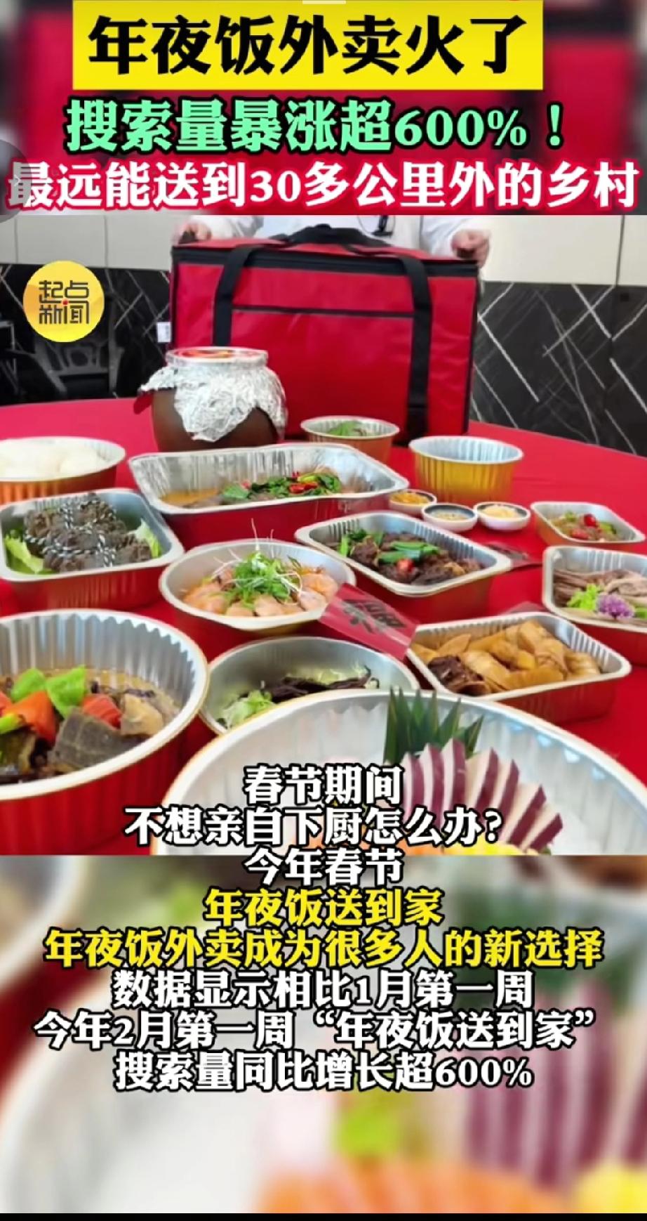 今年年夜饭外卖需求量暴涨,网上搜索量暴涨超600%,不用花费数小时采购、清洗、烹饪,省去备菜和餐后洗碗的繁琐,能专心陪伴家人。(来源于@起点新闻)
