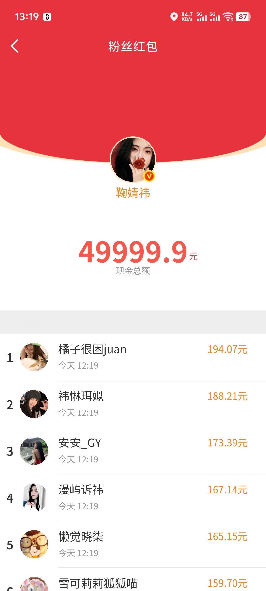 鞠婧祎20万红包明星红包 鞠婧祎出手厉害了,一个红包5万,一下发了20万的红包