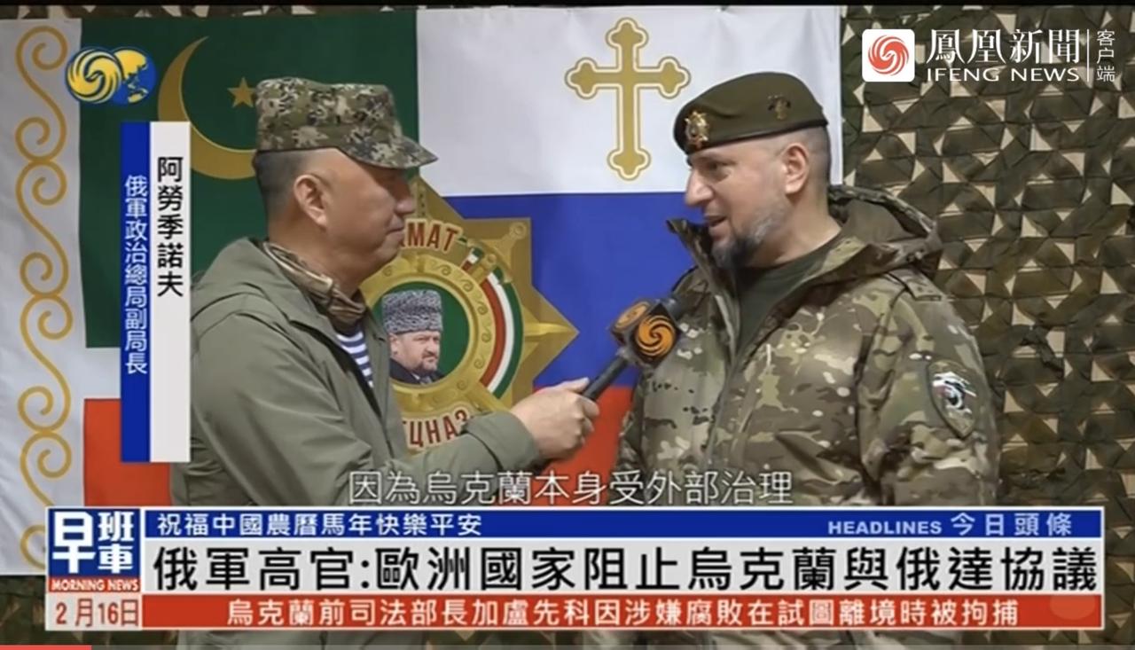 2月16日,凤凰卫视在前线专访俄军政治总局副局长阿劳季诺夫中将。他向中国致以马年新春祝福,并就俄乌谈判表示,欧洲国家阻挠乌俄达成协议,相关举动实为拖延时间、为继续战事做准备。