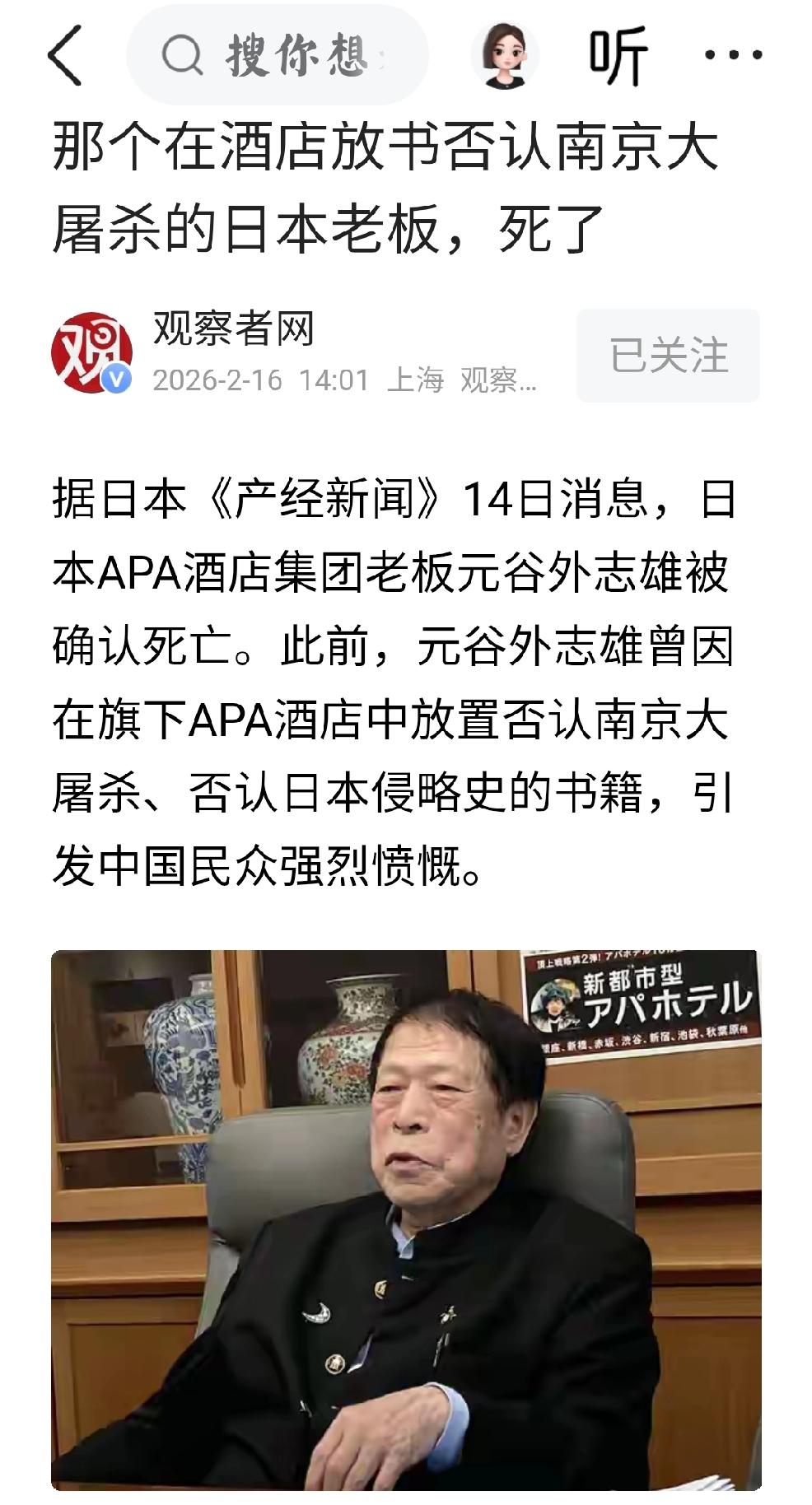 2月14日,日本产经新闻报道,日本apa酒店集团老板,元谷外志雄日前死亡,时年82岁,一头否认南京大屠杀的,老日本人死亡。 个人认为:日本右翼势力的财力与实力受到削弱,这是身为一个中国人极痛快的事情。 个人对这头老日本人献上大红花半枚表达心意。
