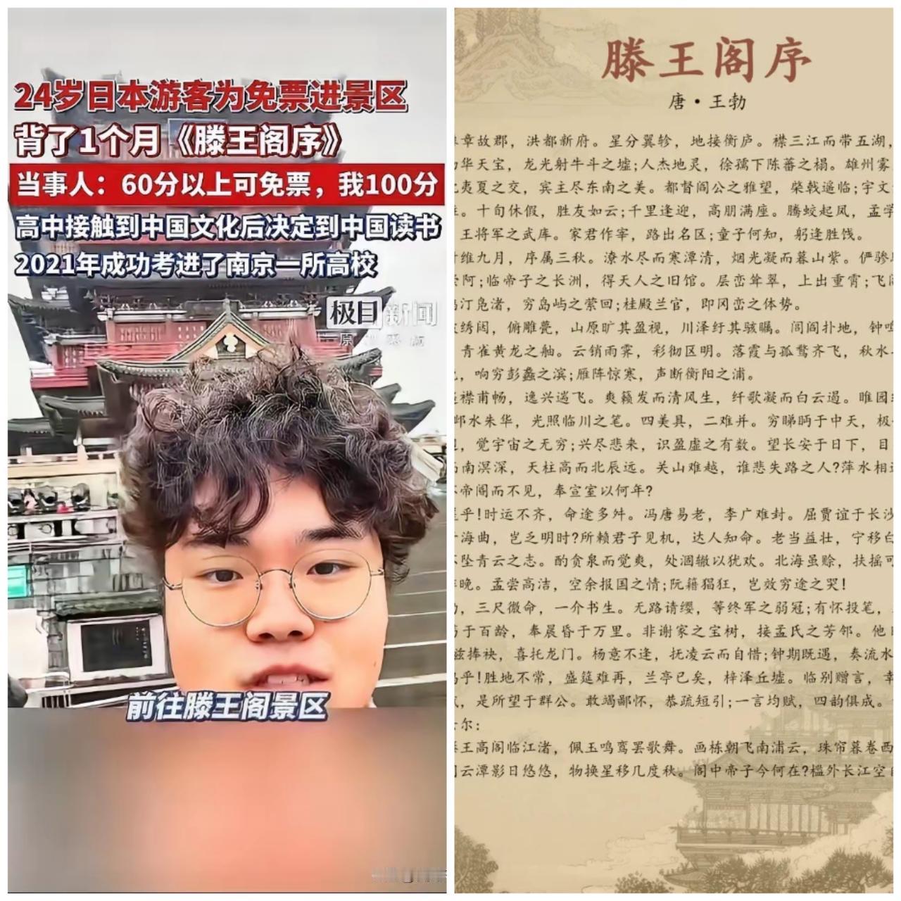 太惊艳!日本小伙满分背完《滕王阁序》,不少中国人自愧不如! 江西南昌滕王阁,24岁日本游客内田大翔一开口就震住全场。短短5分钟,全篇《滕王阁序》流利背完,一字不差,直接拿下100分满分,顺利免票入园。现场游客和工作人员得知他是日本人时,全都惊讶鼓掌。 内田大翔来自名古屋,高中就迷上中国文化,2021年到南京留学,毕业后走遍中国各地。早就听说滕王阁背序免票,他特意准备了一个月,利用碎片时间反复记忆,不是为了省门票,而是真心喜欢这篇千古美文。 很多中国人学生时代背过,早就忘得差不多,一位外国青年却愿意沉下心,花时间啃下古文名篇,这份热爱与坚持,实在难得。 文化从没有国界,真正的经典,能跨越语言与距离,打动每一个真心欣赏它的人。这不仅是一次景区挑战,更是一场跨越国界的文化共鸣,也让更多人看到中华古文的魅力。 你还能流利背出《滕王阁序》吗?