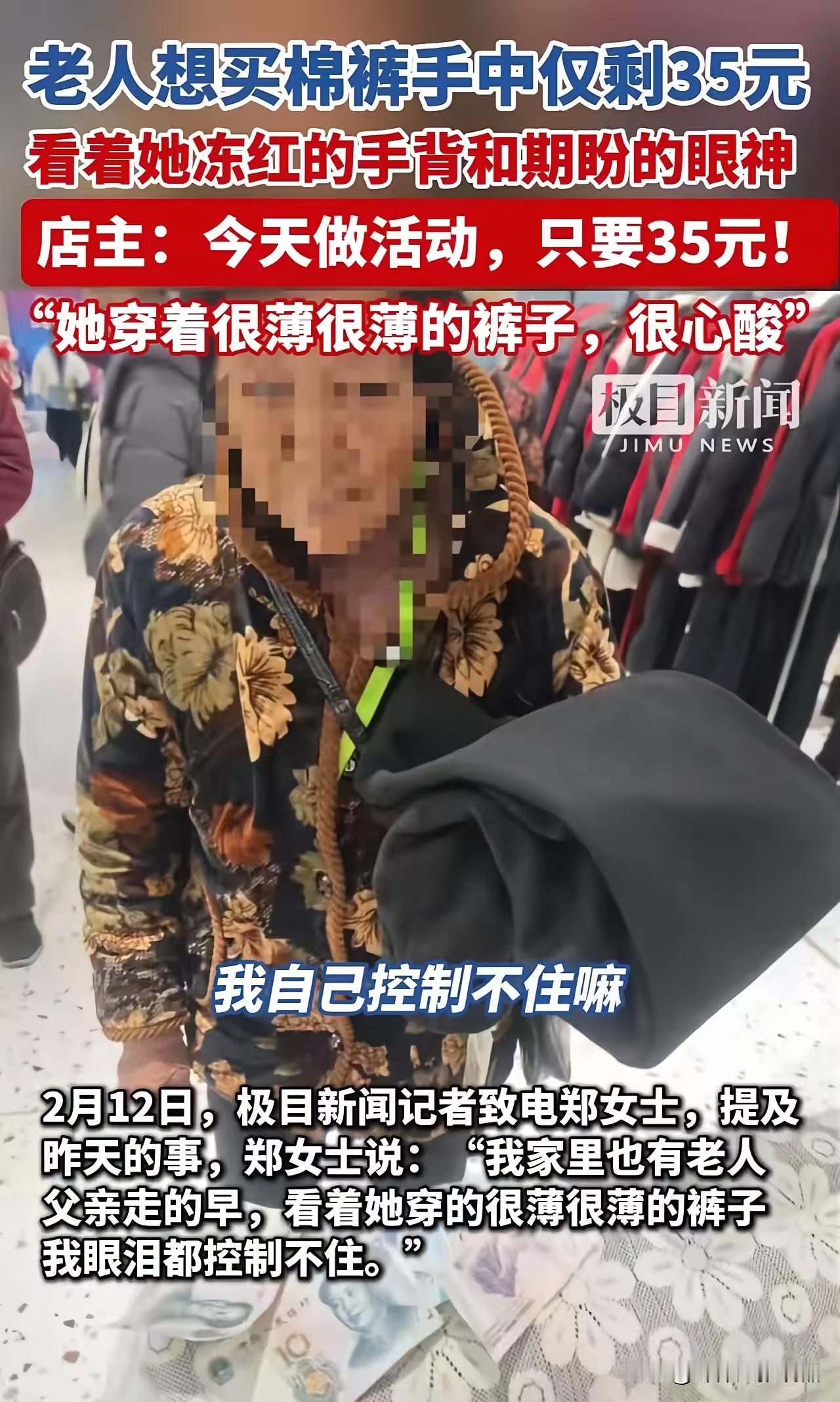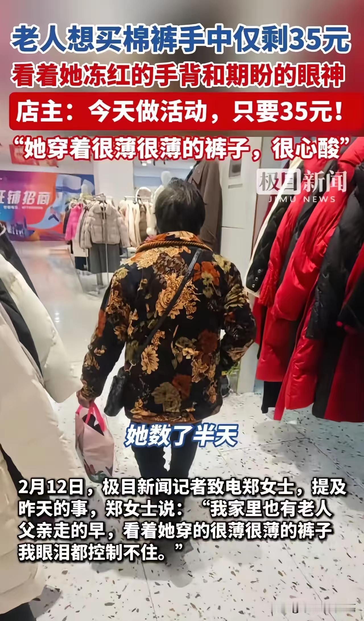 “35块买199元棉裤?店主一句‘今天搞活动’,全网泪崩:这才是人间最暖的善意!” 2026年寒冬,北方小城寒风刺骨,气温直逼零下十度。街边行人裹紧羽绒服匆匆赶路,而一家不起眼的女装店里,却悄然上演了一幕让千万网友集体破防的温情瞬间。 店主郑女士正低头整理货架上的冬装,门铃轻响,三位老人缓缓走了进来。其中一位70多岁的奶奶,穿着单薄得几乎透明的裤子,膝盖处已经磨出毛边,在冷风中微微发抖。她没说话,也没叫店员,只是默默走到一条标价199元的黑色加绒棉裤前,小心翼翼地伸出手,轻轻抚摸那厚实柔软的面料,又翻过来看内衬——眼神里满是渴望,却又透着难以言说的怯懦。 郑女士注意到了这一幕,走上前轻声说:“阿姨,喜欢就试试吧。” 老人抬起头,眼神闪烁,嘴唇微动,似乎鼓足了很大勇气才从怀里掏出一个旧布包。她一层层打开,里面是几张皱巴巴的零钱——最大面额不过20元。她声音低得几乎听不见:“我……只有35块钱,够不够这条裤子的钱?” 那一刻,郑女士的心猛地一揪。她看到老人冻得通红的手背,看到她身上那条薄如秋裤的裤子在寒风中瑟瑟发抖,更看到她眼中那份小心翼翼、生怕被拒绝的卑微。按常理,199元的棉裤只收35块?亏本都算轻的。可就在那一秒,郑女士脱口而出:“哎呀,阿姨!您今天来得太巧了!我们刚好搞活动,这条裤子——就35块!” 话音刚落,老人的眼睛“唰”地亮了,像孩子捡到了糖果,脸上瞬间绽放出久违的笑容。她连连点头,连声道谢,仿佛不是买了一条裤子,而是捡回了整个冬天的温暖。 后来郑女士才从同行的两位老人口中得知:这位奶奶是独居低保户,每月生活费仅100元。那35块钱,很可能是她半个月的饭钱。她省吃俭用,只为给自己添一件能扛住寒冬的棉裤。 接受采访时,郑女士眼眶泛红:“我家里也有老人。看到她穿那么薄的裤子站在冷风里,我眼泪真的控制不住……我还年轻,亏这点钱不算什么。能让老人暖和过冬,我心里也踏实。” 这则故事被发到社交平台后,迅速引爆全网。短短24小时内,阅读量破千万,评论区被泪水与感动淹没: “善良不是富人的专利,是普通人的选择。我们总说社会冷漠,可温暖一直都在,只是藏在这些微小的选择里。” “她没施舍,没怜悯,而是用‘活动价’保全了老人的尊严——这才是最高级的善意:不让你觉得自己在被帮助。” “一句‘你来巧了’,胜过千言万语。她给的不是裤子,是让老人相信:这世界,还有人愿意为我弯一次腰。” 的确,在这个充斥着流量、争议与戾气的时代,人们早已对“正能量”产生审美疲劳。可当真实的人性光辉照进现实,我们才发现——真正的善意,从来不需要宏大叙事。 它可能只是一句轻描淡写的话,一个临时编造的“活动”,一次不动声色的成全。它不张扬,不邀功,甚至不愿被看见。但它足以接住一个即将坠落的尊严,照亮一个孤独老人的整个冬天。 很多人以为善良是捐款百万、建希望小学,却忘了——真正的善意,往往发生在无人看见的角落。它不需要聚光灯,也不求回报,只在某个寒冷的下午,有人愿意为陌生人多想一步,多心软一秒。 郑女士没有拍视频博流量,没有发朋友圈炫耀善举,她只是本能地选择了“心软”。而正是这份本能,让我们看到:人间值得。 这个世界或许冰冷,但只要还有人愿意为陌生人编一个温暖的“活动价”,人间,就永远有光。 如今,那条199元的棉裤早已穿在老人身上,而郑女士的善举,却穿进了千万人心里。有网友自发发起“35元温暖计划”,号召大家在寒冬为孤寡老人买一件御寒衣物;也有商家表示要向郑女士学习,在店里设立“爱心折扣”,专为困难群体保留一份体面。 善意会传染,温暖能接力。郑女士的一句谎言,不是欺骗,而是一束光——它照亮了老人的冬天,也唤醒了我们心底最柔软的部分。 所以,请记住这个平凡却闪耀的名字:郑女士。她不是网红,不是富豪,只是一个普通的店主。但她用行动告诉我们:善良,从来不是能力问题,而是选择问题。 当你面对一个冻得发抖的老人,你会怎么做? 也许答案,就藏在那句轻声说出的“今天搞活动”里。 愿我们都能在别人最需要的时候,成为那个愿意“搞活动”的人。 因为真正的温暖,从来不在热搜榜上,而在每一个选择心软的瞬间。九块九买的衣服 棉裤促销