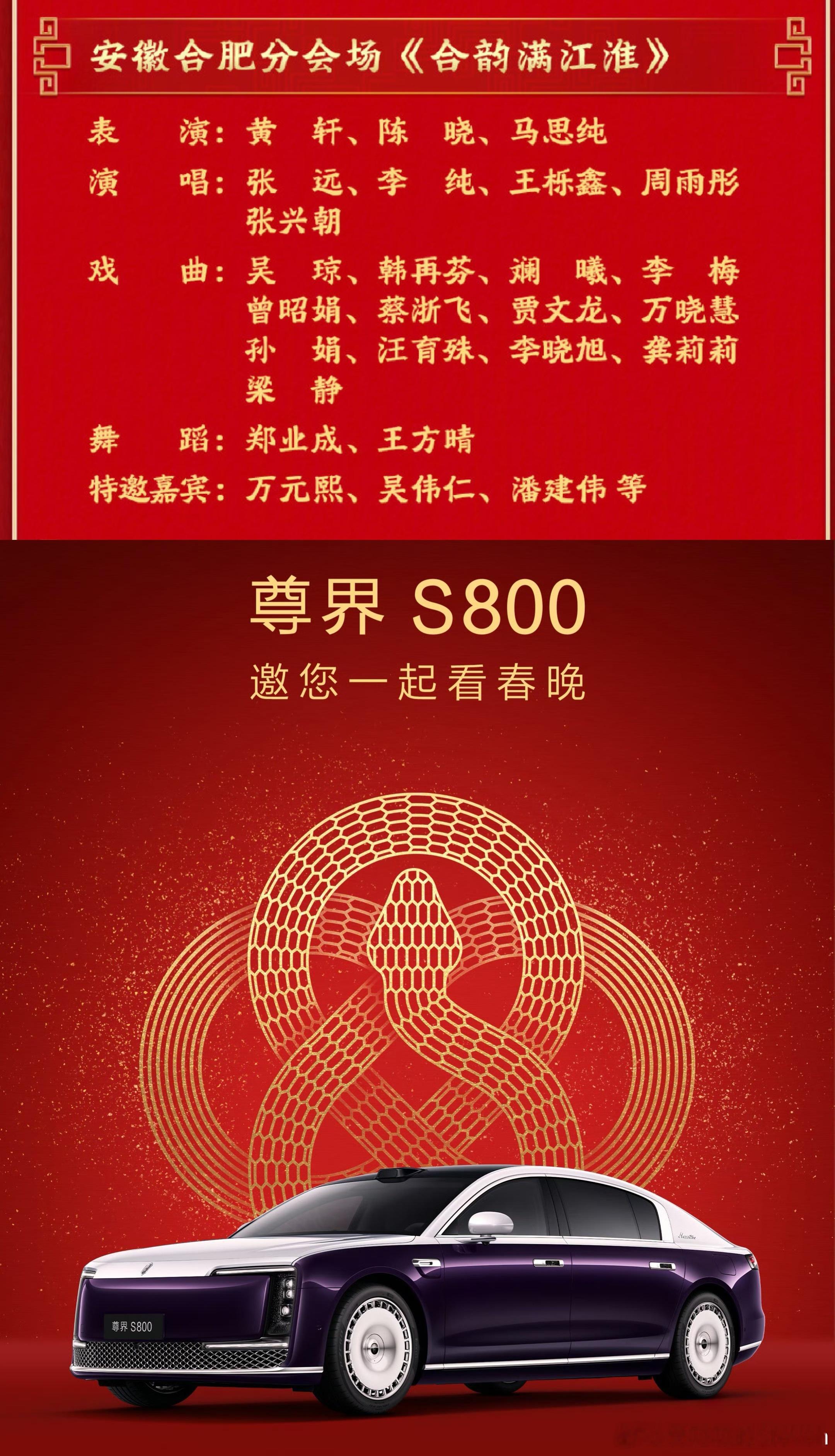 春晚节目单出了,安徽合肥分会场,不知道会是怎么展示科技震撼。去年的M9灯光秀,今年的尊界S800春晚节目单鸿蒙智行连续三年亮相春晚