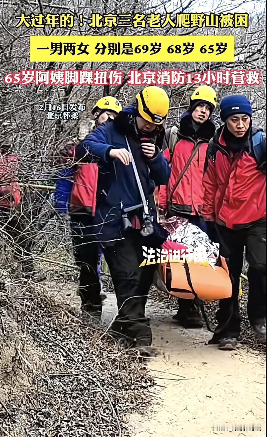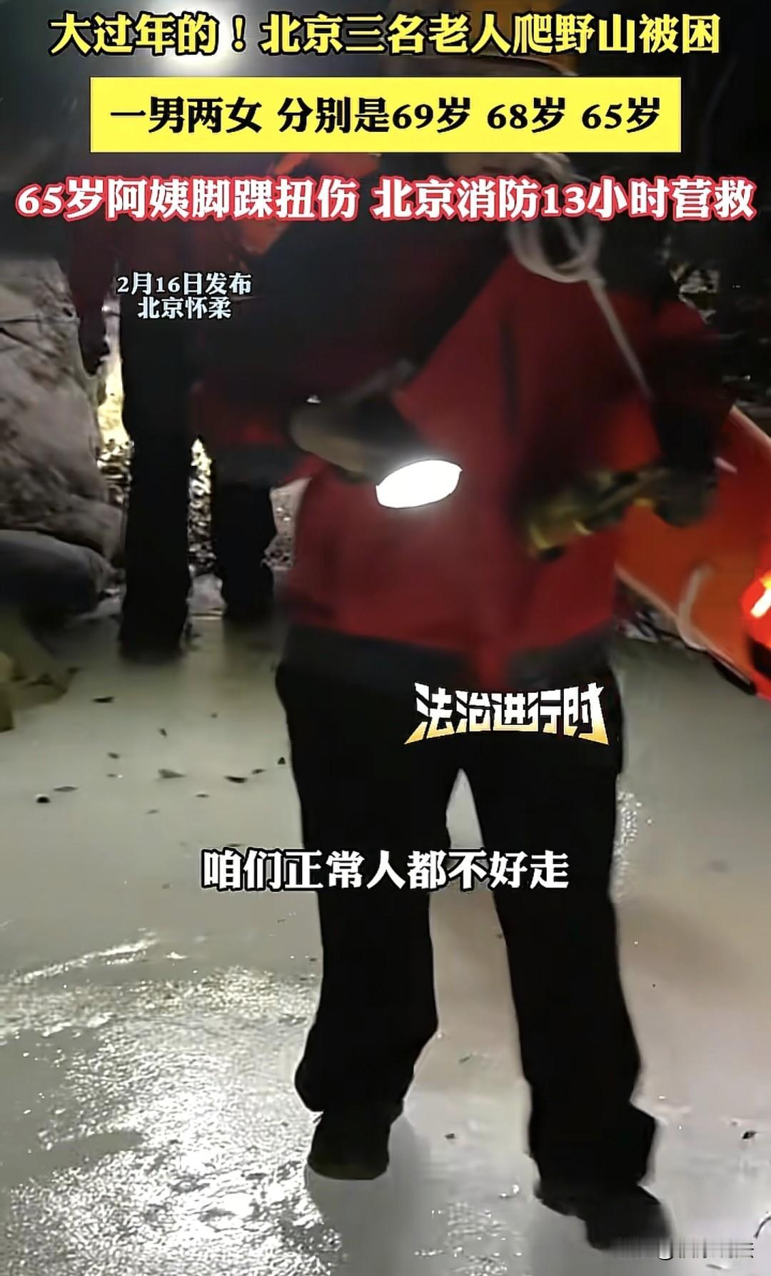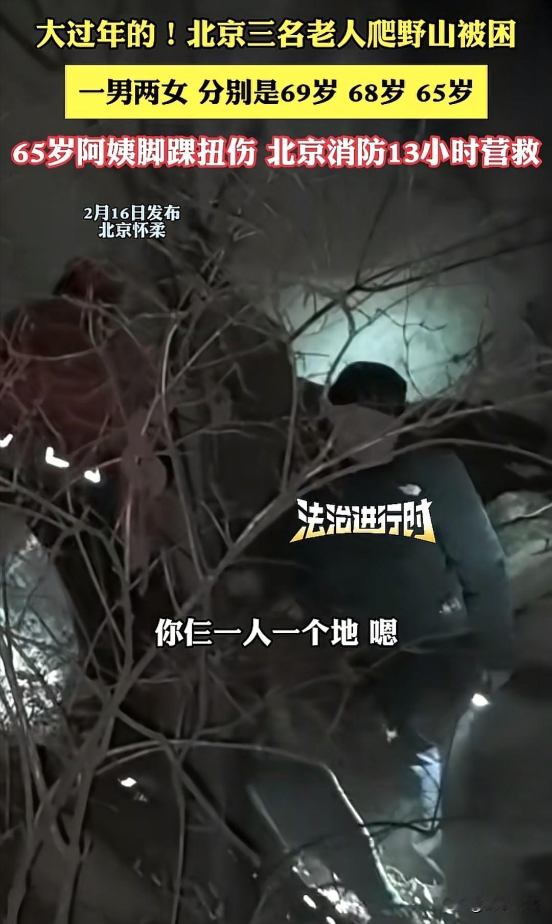 “正是闯的年纪!”大过年的,北京一69岁大爷和68岁、65岁女伴一起爬野山,65岁阿姨不慎扭伤脚踝,3人被困山上。消防营救13小时,黑夜中,消防员感叹:两人动不了,你看那边一个还玩手机呢!看来要鏖战一晚上了。网友:叛逆从来不分年龄。 2月16日,正是大过年的时候,大家都喜气洋洋准备过年,可消防却接到一通特殊的电话:有三个老人爬野山被困,需要营救。 你看消防员连过年都不消停,尽管正值阖家欢聚的时刻,消防员们闻讯后立即整装出发,奔赴救援现场。 可在野山里找三个老人哪那么容易?野山,又是晚上,漆黑一片,气温寒冷,他们要穿过树林去搜寻三个老人。 经过仔细搜寻,消防员们找到了三个老人,一询问,都忍不住惊叹:真是人老心不老。 原来,三个老人,一男两女,相约爬野山,男子69岁,那两位阿姨一个68岁,另一个65岁,年纪都不小了。 而三人被困的原因让人哭笑不得,原来,65岁阿姨在爬山过程中,不小心扭伤了脚踝,动不了了,而那两位就一直陪着她。 当消防员赶到后,分别扶着三个老人,带着他们慢慢下山。 从视频中可以看到,山上乌漆麻黑,树丛杂乱无章,只能靠着手电照明摸索前行,一个消防员无奈的说:这俩人也动不了,你看那边那一个,还玩着手机呢?完了,今天又鏖战一晚上了! 而且,野山道路崎岖,正常人都不好走,更何况三个老人了,又是凌晨,真的挺危险的。 最终,消防员经过13小时将三名老人营救。 结果好在有惊无险,三个老人也无大碍,这都要感谢消防员们,夜里奋不顾身的去营救他们。 有网友看到这令人哭笑不得的一幕,调侃道:正是闯的年纪,够淘气得,真是叛逆从来不分年龄啊。 也有人说, 三十多岁的总是在尽力展示自己还年轻还小,六七十岁的就用各种方式努力证明自己还不老,真应了那句话,再不疯狂我们就老了。 这大爷大妈身体真好,还能爬山,我们年轻人就喜欢玩水,海边,最不愿意爬山,太累了,还是大爷大妈,有的是劲。 还有人表示,为了不在出现这种情况。一定要收费,不收费教育不了冒险者,这几年过年,年年有人去冒险,结果都叫救援。 根据《消防法》第49条规定:国家综合性消防救援队、专职消防队扑救火灾、应急救援,不得收取任何费用。 本案中,消防员在过年期间凌晨冒着严寒和危险营救三名被困老人,属于法定职责范围内的应急救援,即使耗费13小时、动用大量人力物力,也不得向老人或其家属收取任何费用。 这一规定体现了消防救援的公共属性,确保公民在危难时能无顾虑地求助。 消防员为救老人奋不顾身,他们无私奉献、守护生命安全,这种无私救助和担当,值得我们敬重。 另外,过年本是阖家团圆、放松休闲的时候,可消防员却为了救三个爬野山被困的老人,在漆黑寒冷的山上奋战13小时。 他们舍弃了自己的团圆时刻,不顾危险去营救陌生人,这份责任与担当太让人感动。 不过,三位老人年纪都60多岁了,还去爬野山,虽勇气可嘉,但确实有些冒险。 有人说,三个老人可真是能折腾?大过年都不放过消防员这帮孩子们,辛苦一年了,他们也想过个清净年啊?真是太不让儿女省心了吧。 其实,老人想锻炼身体也要量力而行,可以去公园健身,或者风景秀美,但安全的地方休闲,不要不顾危险,野山说爬就爬,这种运动不但不安全,容易受伤,还给别人增添了不必要的麻烦也让子女担心不是? 大家对三个老人爬野山,消防救援13小时,怎么看呢?