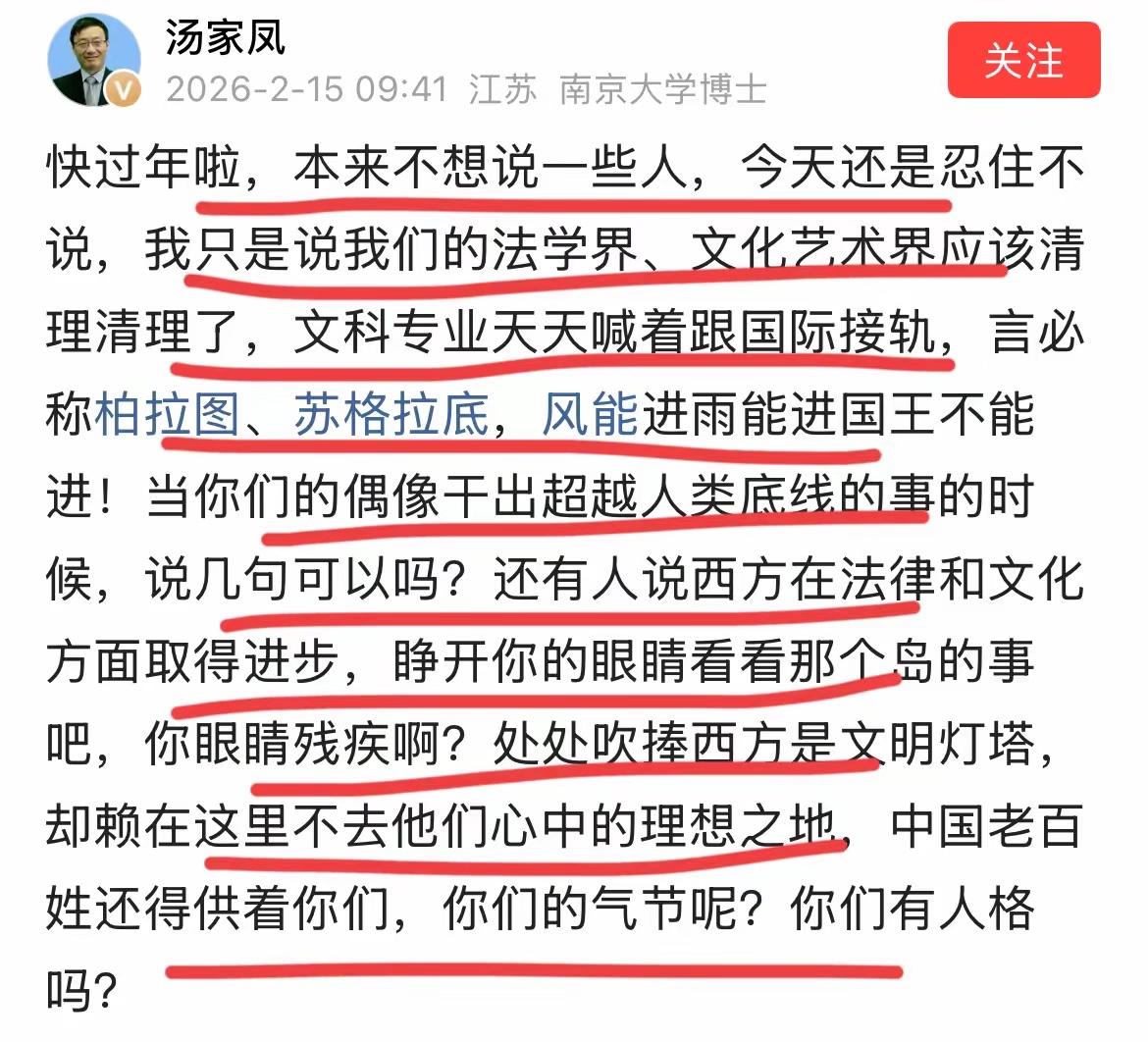 马年春节还没到,汤家凤老师先炸场!一番话直戳某些公知痛处,看得人太解气! 平时张口闭口接轨国际,大谈所谓法治与自由,萝莉岛丑闻曝光、西方精英底线尽失时,这群人却集体装聋作哑,半句话都不敢说。 双标玩到这个地步,还想忽悠谁?如今老百姓早就觉醒了,不会再被空洞话术蒙蔽,更不会迷信被扒得底朝天的西方神话。 那些吃着中国饭、砸着中国锅的人,该醒醒了!时代变了,崇洋媚外的套路早已行不通。 马年新气象,歪风邪气就该彻底清理!你支持汤老师这番硬核发声吗?