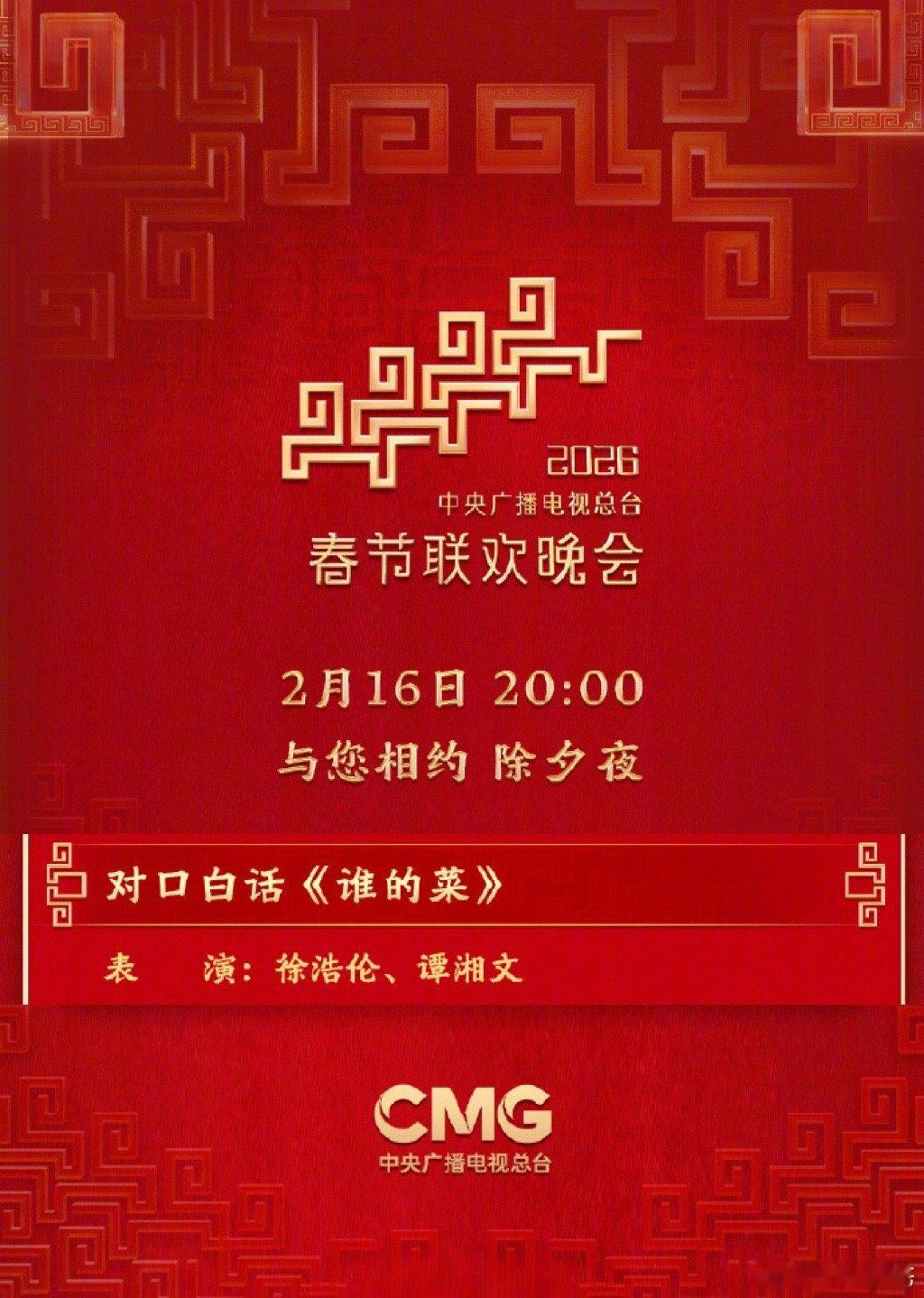 徐浩伦谭湘文二登春晚 这对白话兄弟又上春晚了!去年他们的表演还记忆犹新,今年带来《谁的菜》,光听名字就觉得有梗。坐等今晚的爆笑包袱!