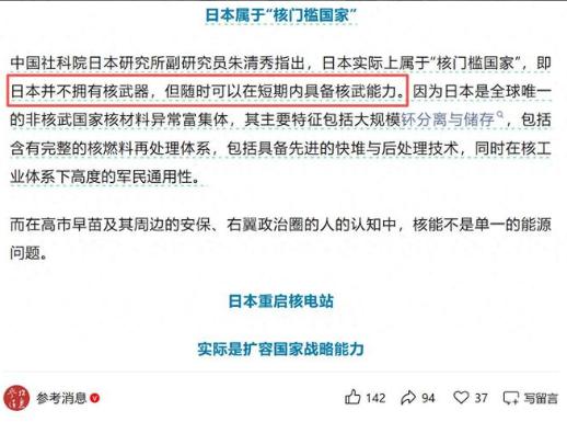 日本造核武,美国不拦,谁也拦不住。中俄本来有能力拦,因为美国,最终还是拦不了,这就是现实。 日本其实早就具备造核武的实力,手里囤积的核材料、掌握的核技术,早就够支撑它快速造出核武了。2024年底,日本国内就有8.6吨未辐照分离钚,光这一点,就够造1000多枚核装置,再加上存放在英法的部分,家底厚得吓人。 更别说它的六所村铀浓缩厂,2025年10月已经重新接收原料,随时能恢复高浓铀提炼,民用转军用也就是一句话的事。按实际能力算,日本只要下定决心,半年到一年就能造出可引爆的核装置,三五年就能形成核武库,速度快得惊人。 但日本敢这么攒家底、探底线,核心就一个——它算准了美国不会拦,甚至还会暗中撑腰。美国心里的小算盘打得明明白白,就是要把日本打造成制衡中俄的棋子,让日本在东亚替自己打头阵,日本造核武,不仅威胁不到美国本土,还能牵制中俄,打乱东亚的安全格局,对美国来说,这是稳赚不赔的买卖,怎么可能真的去拦? 这些年,美国的双标操作简直不要太明显,嘴上喊着核不扩散,背地里却一步步放松对日本的限制,不管是民用核技术合作,还是安保条约的强化,都是在给日本传递信号:只要你跟着我,造核武的事,我就当没看见。 2015年11月联合国第一委员会投票,日本自己提的废除核武器决议,美国首次投了弃权票,英法也跟着弃权,说白了就是一场演给全世界看的戏,美国用弃权的方式,明晃晃地默许日本的核小动作,也等于告诉所有人:日本的事,我护着,谁也别想插手。 其实中俄真不是没能力拦,作为联合国安理会常任理事国,我们有外交话语权,有军事威慑力,也有足够的实力推动国际社会出台约束措施。 2015年10月,中国裁军大使傅聪就在联大直接点破日本的核材料隐患,明确反对日本囤积核材料;之后的几年里,中俄也多次在国际场合发声,甚至尝试推动联合国出台相关决议,想按住日本的核野心,但每次都被美国硬生生拦下。 美国要么动用安理会否决权,直接否定中俄提出的相关提案,要么联合自己的盟友抱团施压,把中俄的努力全部抵消。 毕竟美国的霸权摆在那里,军事、外交、经济实力都能给日本兜底,就算日本的核野心昭然若揭,就算中俄拿出再多合理的反对理由,只要美国不松口,任何约束措施都落不了地。 我们有能力施压,有能力警告,却架不住美国拼尽全力护犊子,就像大人护着自家犯错的孩子,不允许别人多说一句,更不允许别人动手管教。 这就是最无奈的现实:不是中俄没能力拦,是我们的对手太强大,美国的霸权主义,让我们的努力一次次落空。 日本也清楚,只要抱住美国的大腿,就没人能真正拦住它,所以才敢一步步试探底线,一点点囤积核材料,等着捅破那层窗户纸。 有人可能会问,就真的一点办法都没有吗?答案很残酷:没有。国际社会的规则,从来都是强者说了算,美国不拦日本造核武,不是因为善良,而是因为有利可图;中俄拦不住,不是因为我们没本事,而是因为美国的掣肘太多。 说到底,日本造核武这件事,核心从来不是日本有多厉害,而是美国愿不愿意拦。美国不拦,谁也拦不住,中俄再有能力,也架不住美国的霸权撑腰。 这不是什么道理,而是当下最真实的国际格局——没有所谓的公平正义,只有实力的较量,美国不想拦,就算中俄拼尽全力,最终也只能是徒劳,这就是我们必须接受的现实。