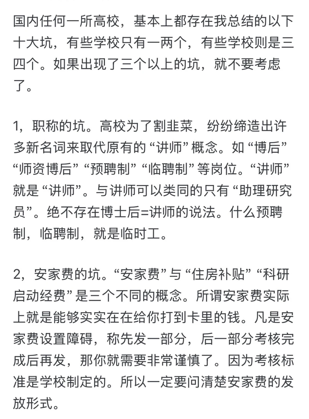 1,职称的坑。高校为了割韭菜,纷纷缔造出许多新名词来取代原有的“讲师”概念。如“博后”“师资博后”“预聘制”“临聘制”等岗位。“讲师”就是“讲师”。与讲师可以类同的只有“助理研究员”。绝不存在博士后=讲师的说法。什么预聘制,临聘制,就是临时工。