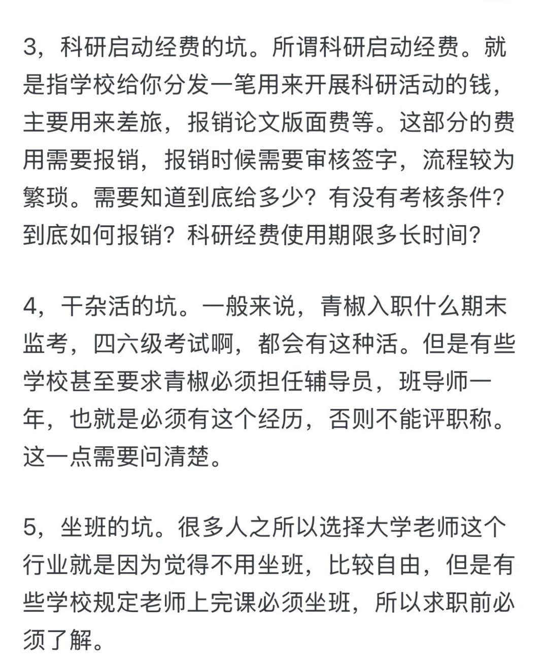 5,坐班的坑。很多人之所以选择大学老师这个行业就是因为觉得不用坐班,比较自由,但是有些学校规定老师上完课必须坐班,所以求职前必须了解