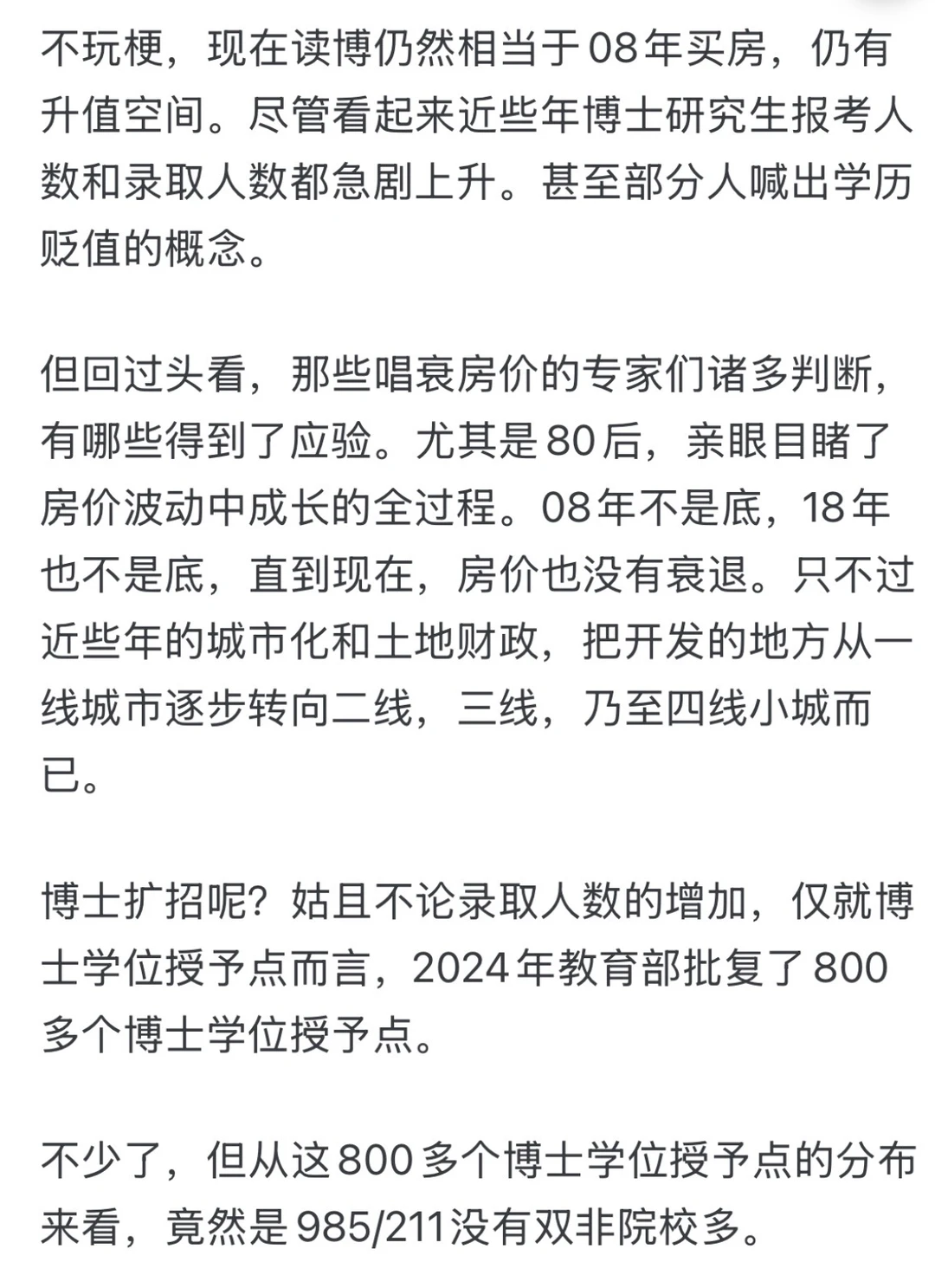 不玩梗,现在读博仍然相当于08年买房,仍有升值空间。尽管看起来近些年博士研究生报考人数和录取人数都急剧上升。甚至部分人喊出学历贬值的概念。