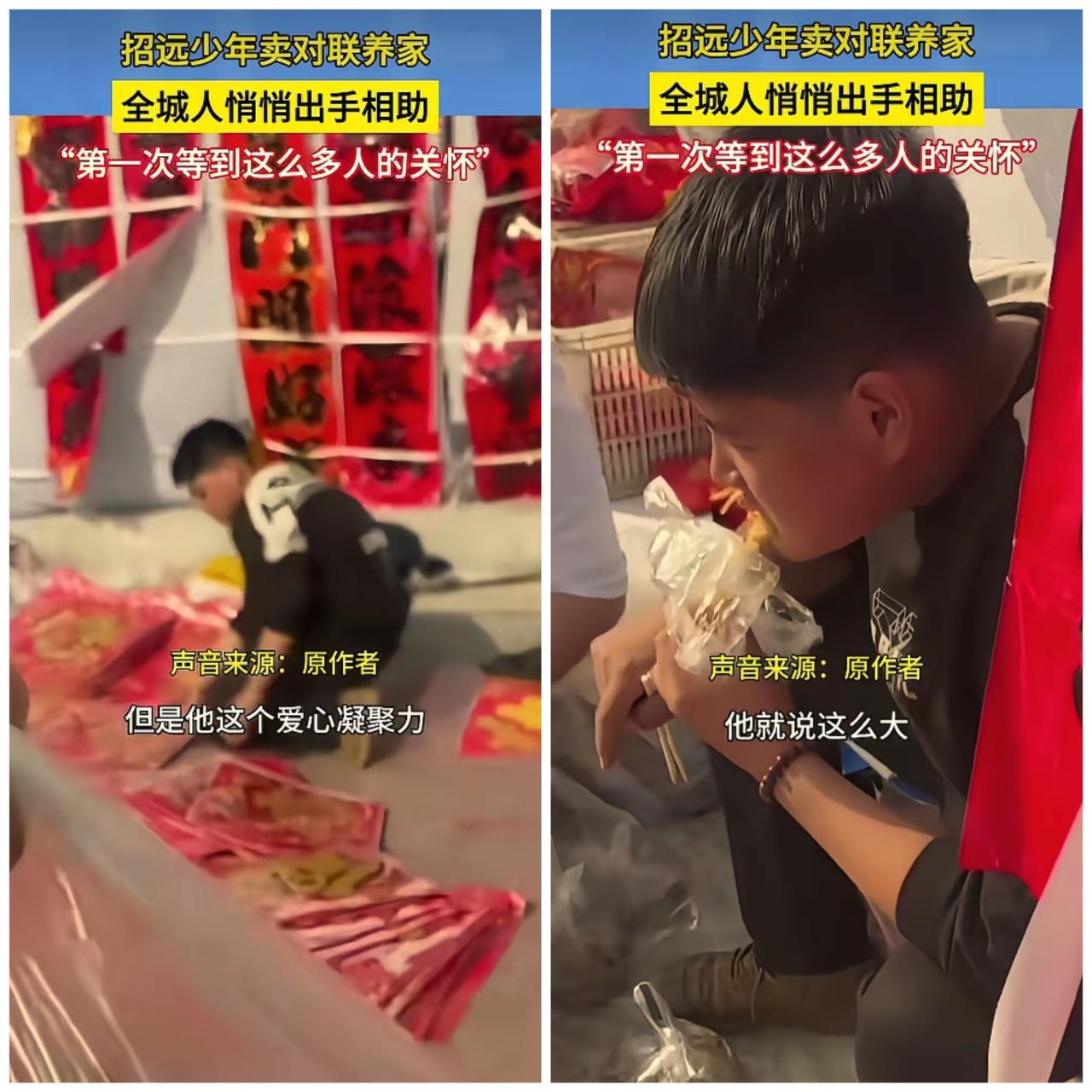 太心酸了!山东烟台14岁少年摆摊卖对联,背后的故事看哭全网,这才是少年最该有的模样。 本该在校园里嬉笑打闹、在父母怀里撒娇的年纪,他却早早扛起了生活的重担。父亲早已离世,母亲刚做完手术卧床休养,家里没了收入来源,他只能趁着假期,在寒风里守着小小的对联摊,撑起这个摇摇欲坠的家。 福字五毛一张,对联几块钱一副,他把价格压到最低,只想薄利多销,多赚一点钱给妈妈治病、补贴家用。白天守摊,晚上回家还要给妈妈做饭,小小的身影,在寒冬里显得格外单薄,却又无比坚韧。 一位好心大哥路过摊位,得知他的遭遇后心疼不已,悄悄塞给他200元钱,想帮他渡过难关。可少年坚决不收,追出老远把钱还了回去。他宁愿自己多辛苦一点,靠双手赚钱,也不愿白白接受别人的施舍,这份骨气,让人心疼又敬佩。 大哥没有放弃,隔天特意送来10斤牛肉,怕少年拒绝,还谎称让他包好饺子回请自己。少年答应了,当天忙完一整天,真的端着一大盘热气腾腾的饺子,专程送到大哥面前。 这盘饺子,裹着少年的感恩与懂事,也藏着陌生人的温柔与善意,大哥吃在嘴里,暖在心里,差点红了眼眶。 视频发到网上后,瞬间温暖了整座城市。无数市民自发来到摊位前买对联,有人默默带来年货和生活用品,同学们也赶来帮忙,小小的摊位前排起了长队。少年在人群中忍不住落泪,说这是长这么大,第一次感受到这么多关心。 很多人说“穷人家的孩子早当家”,可哪有天生坚强的孩子,不过是生活逼着他快速长大。他不抱怨、不低头,有骨气、懂感恩,用稚嫩的肩膀扛起责任,这份担当,比很多成年人都难得。 这世上最动人的,从来不是惊天动地的壮举,而是困境中的坚守,是陌生人之间的守望相助,是少年骨子里的善良与骨气。 愿这个懂事的少年,往后少尝生活的苦,多享人间的甜,和妈妈平安健康,未来一路繁花。 你被这位14岁少年的懂事打动了吗?欢迎在评论区留下你的祝福。