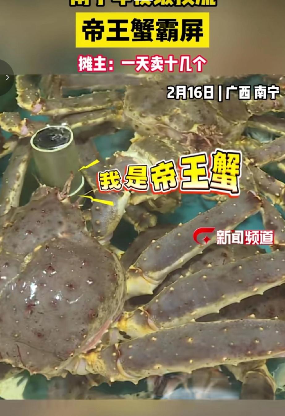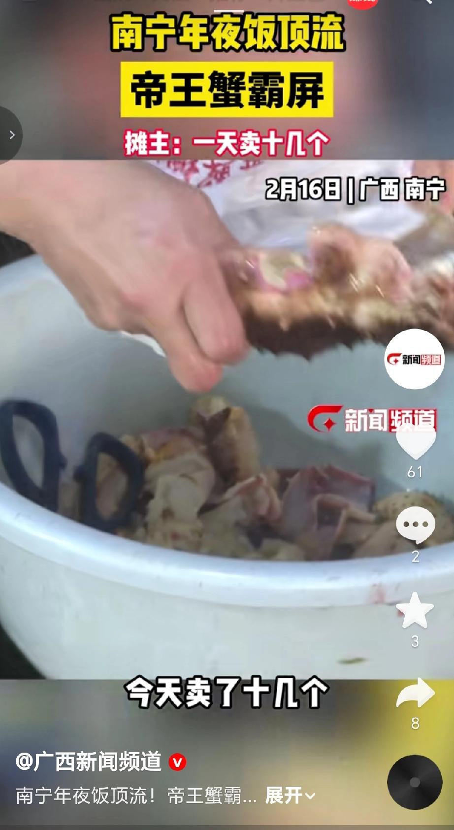 今年节前帝王蟹迎来销售热潮,有商户表示年夜饭时段帝王蟹销量大幅上涨,单日能卖出十几个,和视频标题提及的内容相契合;同时南宁市场的高端海鲜年夜饭套餐也常包含帝王蟹,价位多在3888元~5888元区。(来源于@广西新闻频道 )