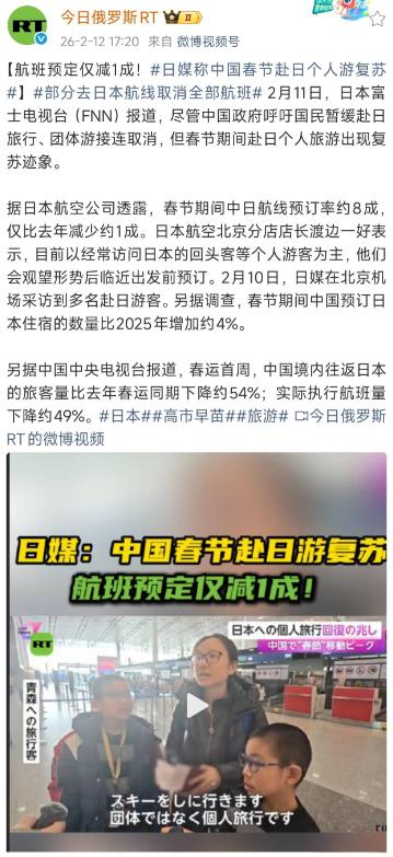 航班预定仅减1成!2月11日,日本富士电视台报道:尽管中国政府呼吁国民暂缓赴日旅行、团体游接连取消,但春节期间赴日个人旅游出现复苏迹象。 这事挺有意思的,国家那边三番五次提醒,春节期间尽量别去日本,可偏偏还是有一批人,挤破头也要去。日本富士电视台2月11号专门报道,说中国赴日个人旅游出现了复苏迹象,航班预订率只比去年少了大概一成。乍一听,好像国家的提醒没起啥作用,但仔细琢磨,完全不是那么回事。 这波所谓的“复苏”,根本不是以前那种大巴团、购物团的卷土重来。恰恰相反,是游客的“成分”彻底变了。现在还在往日本跑的,绝大多数都是熟客、回头客。 用日本航空北京支店长的话说,这些人对日本门儿清,经常往返,他们不跟团,自己订票、自己规划路线,对外部提醒的反应没那么敏感。他们会先观望形势,等到临近假期,觉得“好像也没啥大事”,才果断下单。这种出行方式,灵活得很,跟以前那种提前几个月报团、行程固定的模式完全两样。 所以,光看日本航空公司说的“预订率只降一成”,容易产生错觉。你得看整体的大盘子。中国官方统计的春运首周数据显示,中国境内往返日本的旅客量,比去年同期直接腰斩,暴跌了54%;实际执行的航班量也下降了49%。 更关键的是,今年2月份,有49条中日航线直接取消了所有航班,彻底停飞。北京飞名古屋、南通飞大阪这些航线,干脆一个班次都没了。这说明什么?说明总客流是断崖式下跌,但剩下的运力,被这些执意前往的个人游客给填得比较满。 这种结构变化,让日本的商家们几家欢喜几家愁。札幌狸小路那些专门做游客生意的土产店老板快哭了,以前靠中国游客扫货,销售额稳居第一,今年直接腰斩,连前三都排不上。可同样是札幌,市中心的景观酒店老板却笑开了花。以前团客住一晚就走,现在散客一住就是四五晚,以酒店为据点,慢慢逛、深度玩,虽然总人数少了,但人均消费稳,赚的钱一点没少。 京都的传统旅馆也一样,面向旅行团的团餐订单少了一大半,但面向散客的怀石料理,却常常被订满。说白了,市场在重新洗牌,高度依赖廉价大巴团和集中采购的商家压力山大,而能吸引高净值散客、提供深度体验的商家,反而找到了新机会。 那为什么国家要反复提醒呢?这可不是随口说说。外交部1月26号通过“领事直通车”发消息,理由写得很直白:近段时间日本社会治安不好,针对中国公民的违法犯罪案件多发;而且多地连续发生地震,日本政府自己都发布了后续地震警告。东京、福冈这些中国游客常去的城市,近期抢劫、袭击案件频发,可破案率还不到三成。在这种情况下,国家的提醒是基于事实的善意警示,优先保障公民的安全,是国际通行的做法。 可总有一部分人,抱着侥幸心理,觉得“朋友说一切如常”、“自己小心点就没事”,把国家的提醒当耳旁风。更让人无奈的是,人一多,出洋相的就少不了。有报道提到,在京都的JR车站,大批中国游客挤在铁道口,把狭窄的道路堵得水泄不通,甚至逼停电车长达20分钟。 在北海道小樽,有人无视当地警示,模仿之前出事的游客在铁轨上拍照,逼得当地政府不得不增派警卫。这些行为,不仅给自己带来风险,也让国人的形象蒙羞。日本网友对此也很不满,有人直言“原以为今年能过个安静的春节”,甚至呼吁应该采取更严格的限制措施。 其实,今年春节出境游的选择很多。泰国、马来西亚这些免签目的地热度暴涨,价格实惠又安全。大多数人还是听劝的,那少数执意前往的人,满足了自己的出行需求,却可能忽视了潜在的风险和应守的规矩。 这件事说到底,反映的是中国出境游市场的深层变化。旅游早就从“组织行为”变成了“个人决策”。当出行掌握在个人手中,政策的“倡议”对消费行为的约束力自然会下降。市场表现出的,是一种更分散、更灵活,同时也更考验个人判断力和文明素养的新形态。国家的提醒,是底线思维的体现;个人的选择,则需要在享受自由的同时,扛起对自身安全和国家形象的责任。这中间的平衡,才是真正考验人的地方。