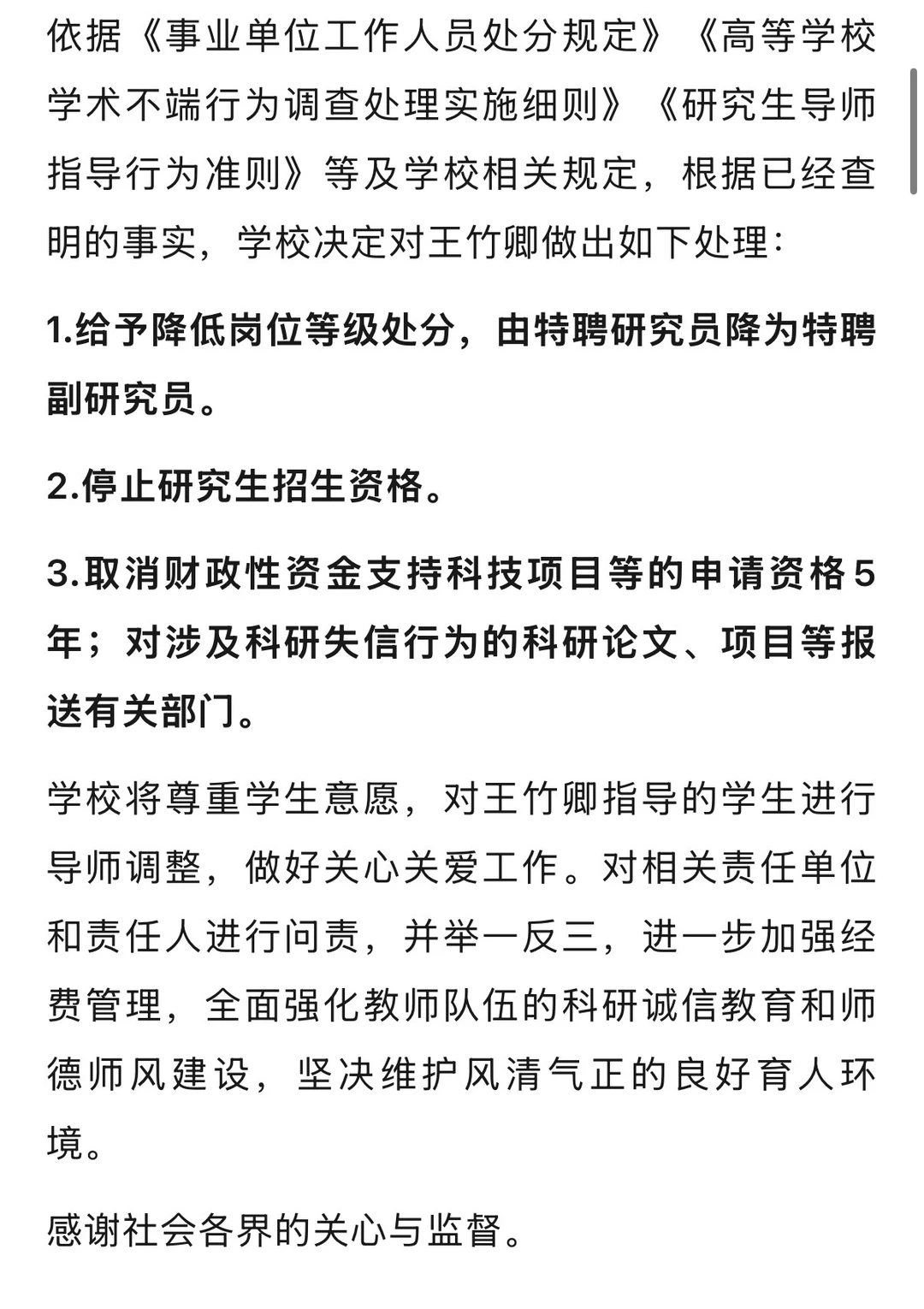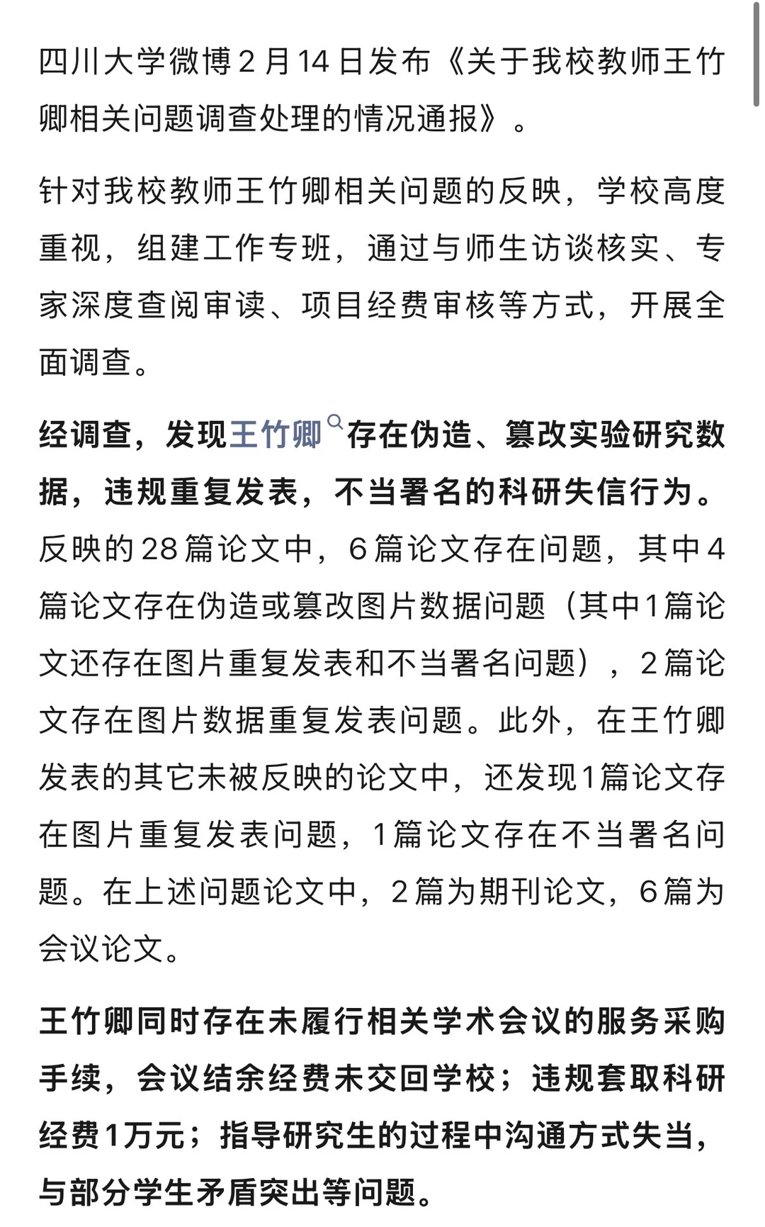 四川大学微博2月14日发布《关于我校教师王竹卿相关问题调查处理的情况通报》。