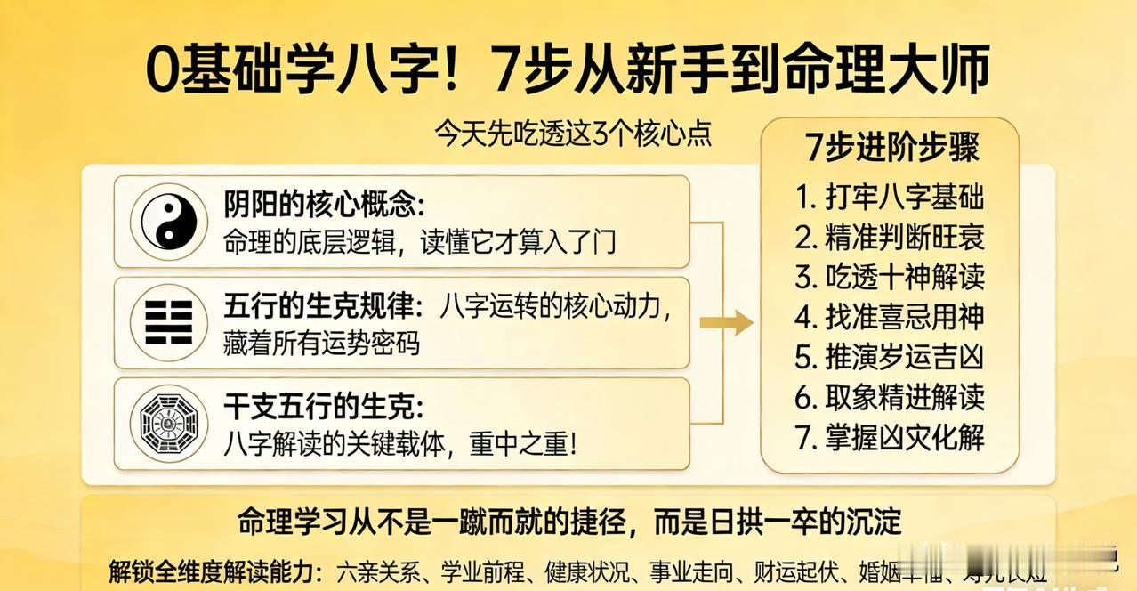 0基础学八字!7步从新手到命理大师,今天先吃透这3个核心点 想读懂自己的八字,却被阴阳五行、天干地支绕得头晕? 别慌!这套保姆级八字入门课,带你跳过弯路,从零开始系统进阶! 这是八字系统课的第一站,也是最关键的地基! 不管你是纯小白,还是看过几本命理书却依旧入门无门的朋友,今天这3个核心知识点,一定要锁死: ✅ 阴阳的核心概念:命理的底层逻辑,读懂它才算入了门 ✅ 五行的生克规律:八字运转的核心动力,藏着所有运势密码 ✅ 干支五行的生克:八字解读的关键载体,重中之重! 很多人学八字越学越乱,根本原因是没走对路! 牢记这7个进阶步骤,从新手到命理大师,一步不落: 1. 打牢八字基础 2. 精准判断旺衰 3. 吃透十神解读 4. 找准喜忌用神 5. 推演岁运吉凶 6. 取象精进解读 7. 掌握凶灾化解 命理学习从不是一蹴而就的捷径,而是日拱一卒的沉淀。 随着经验累积、认知提升,你终将解锁六亲关系、学业前程、健康状况、事业走向、财运起伏、婚姻幸福、寿元长短等全维度解读能力! 从今天起,跟着节奏一步步学,不用死记硬背,不用盲目摸索,轻松解锁八字命理的奥秘,读懂自己的人生剧本! 关注我,下节课带你拆解阴阳的核心逻辑,零基础也能听懂!