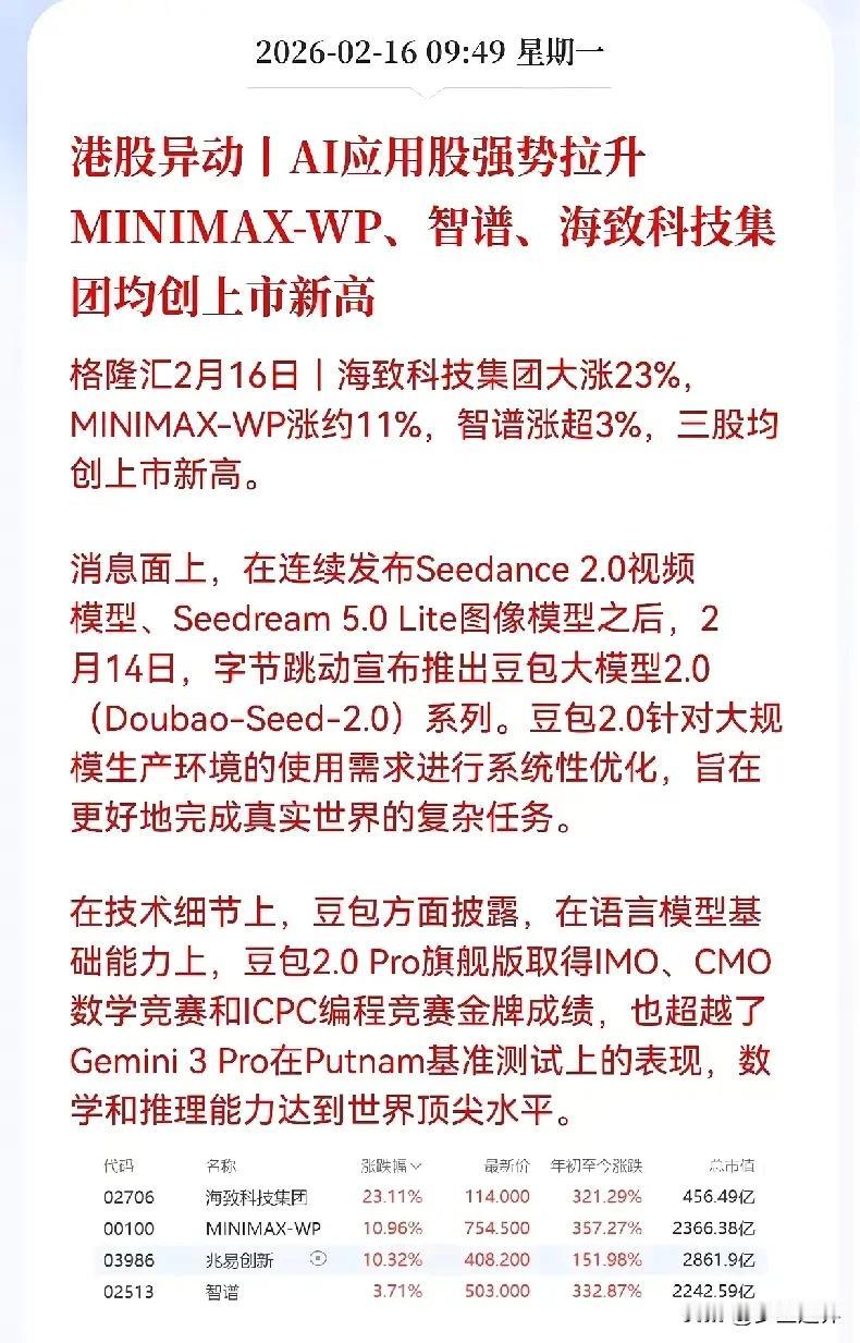 2026马年除夕·AI大局终极复盘 一、技术底座:告别参数军备,迎来效率革命 核心逻辑: 模型进化从“堆参数”转向“提效率”,普惠AI时代正式开启。 ①千问Qwen3.5(除夕王炸): 采用“混合注意力+极致稀疏MoE”架构,实现速度10倍跃升、成本骤降90%。GPT-4级代码能力首次实现在消费级MacBook本地运行,彻底打破算力壁垒。 ② DeepSeek V4(能力封顶): SWE-bench Verified得分泄露高达83.7%,超越Claude与GPT,树立代码智能新标杆,倒逼全行业技术迭代。 - 结论: 技术红利引爆Token消耗指数级增长(视频/Agent/长上下文),算力需求进入“通胀”前夜。 二、春晚引爆:全民算力大考,超级入口争夺战 核心逻辑: 春晚成为AI产品的“国家级压力测试”与全民普及的引爆点。 ①全场景渗透(含金量拉满): 1)豆包(字节): 央视春晚独家互动,承担实时字幕与智能导播,直面亿级并发压力。 2)千问(阿里): 承包多台卫视权益,豪掷30亿春节营销,打通外卖/买票等生活场景。 3)元宝(腾讯): 依托微信生态撒10亿红包,复刻“红包神话”,抢占社交入口。 ②从“围观”到“刚需”: 用户不再旁观,而是亲手上线写春联、点奶茶。千问DAU飙升至7352万,高并发下的“卡顿”恰恰印证了需求的真实性。 ③结论: 红包只是烟雾弹,争夺“AI超级入口”才是核心,用户习惯的强制养成已完成。 三、供需失衡:算力通胀来袭,价值全面重估 ①核心逻辑: 需求爆炸 + 供给受限 = 算力作为“数字石油”的价值重估。 ②智谱“求救信号”(实锤): GLM-5因需求激增导致服务排队,公开致歉并全网招募“算力合伙人”,坐实“算力荒”。 ③产业链全线涨价: 1)上游(硬通货): HBM/DRAM合约价暴涨、光模块供不应求。 2)中游(承压): 亚马逊、谷歌、优刻得相继上调云服务价格。 3)下游(价值定价): 智谱AI宣布GLM Coding套餐涨价30%起。 ④ 结论: 这不是短期波动,而是算力定价权的长期重塑。 四、市场映射:应用爆发,生态定胜负 ①核心逻辑: 资金向能落地的场景集中,算力基建与应用双轮驱动。 ②应用端爆发: 海致科技(+29%)、MINIMAX(+24.5%)等AI智能体/垂直模型板块领涨,证明市场对“落地变现”的渴望。 ③ 平台格局推演: 1) 腾讯(内嵌派): 依托微信高频入口,AI内嵌红利最大,获客成本极低。 2)阿里/百度(独立App派): 面临独立App与生态内嵌的博弈,考验产品独占性。 ④结论: 紧握算力基建(上游)与AI应用(下游),是穿越周期的唯一法门。 ⑤总结:马年大吉,算力为王 1)技术上: 普惠AI到来,好用且便宜。 2)场景上: 春晚引爆全民渗透,Token需求不可逆。 3)产业上: 算力荒倒逼涨价,上游基建价值凸显。 4) 投资上: 紧握AI应用(智能体/垂直模型) + 算力基建(芯片/光模块/云计算)。 五、两大投资方向聚焦 1. 产业链深度挖掘(全链路视角) ①上游硬科技: 算力芯片(GPU/ASIC)、存储(HBM/DRAM)、光模块/光芯片、液冷/温控、高速连接(PCB/CCL)。 ②中游基础设施: 算力租赁、云计算(IaaS)、智算中心、CDN与边缘计算。 ③ 下游应用层: 垂直大模型、AI智能体、春晚合作落地项目、高频内嵌场景(微信/办公/浏览器)。 2. 商业模式深度对比 ①独立App模式(字节/阿里/百度): ②优势: 品牌独占、用户数据闭环。 ③ 劣势: 获客成本高,留存依赖极致体验。 3.生态内嵌模式(腾讯): ①优势: 依托社交裂变,获客成本几乎为零,渗透率极高。 ② 劣势: 变现路径依赖平台规则。 ③胜负手: 短期看流量(内嵌胜),长期看“入口分层+场景独占”的共生格局。