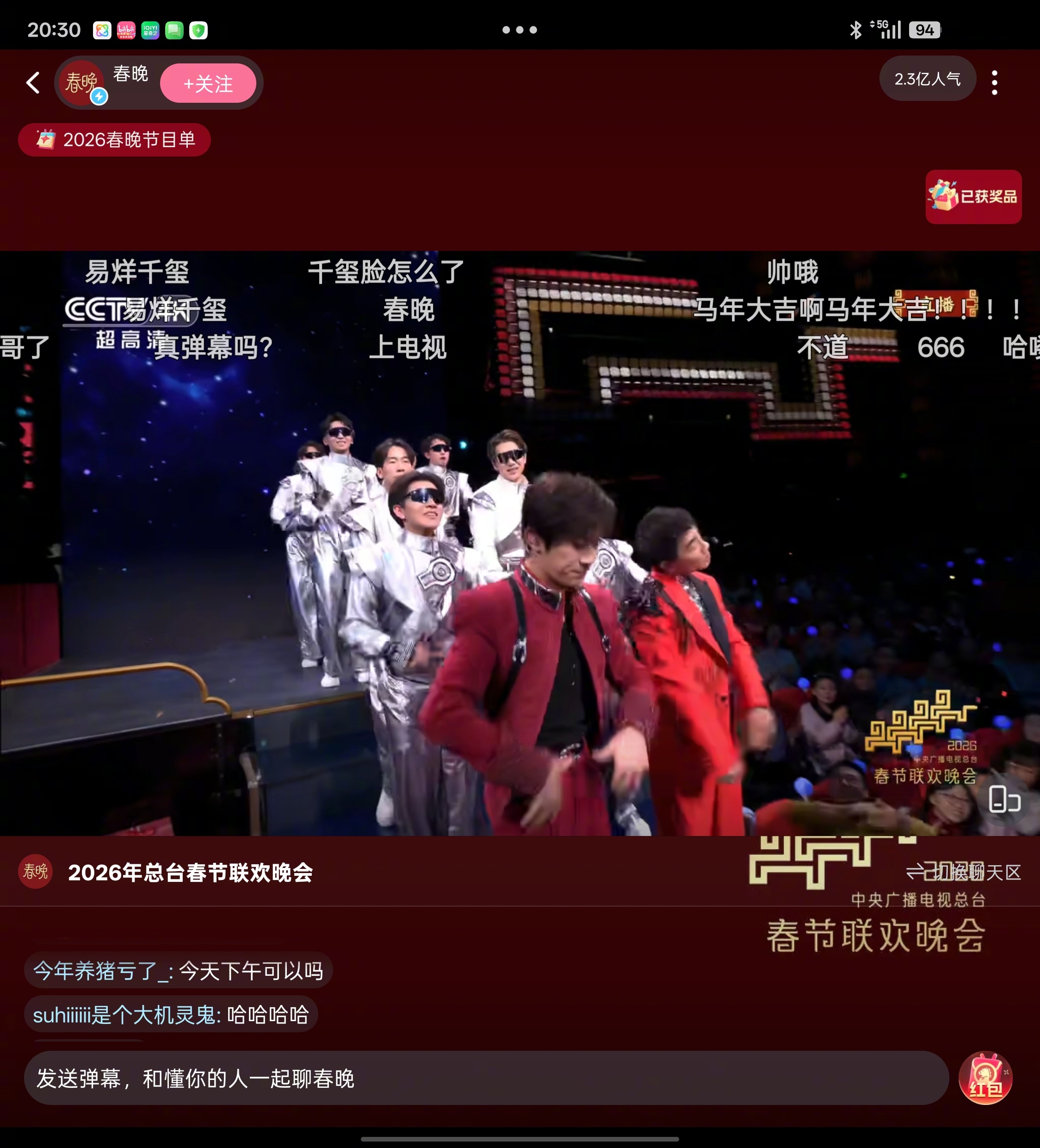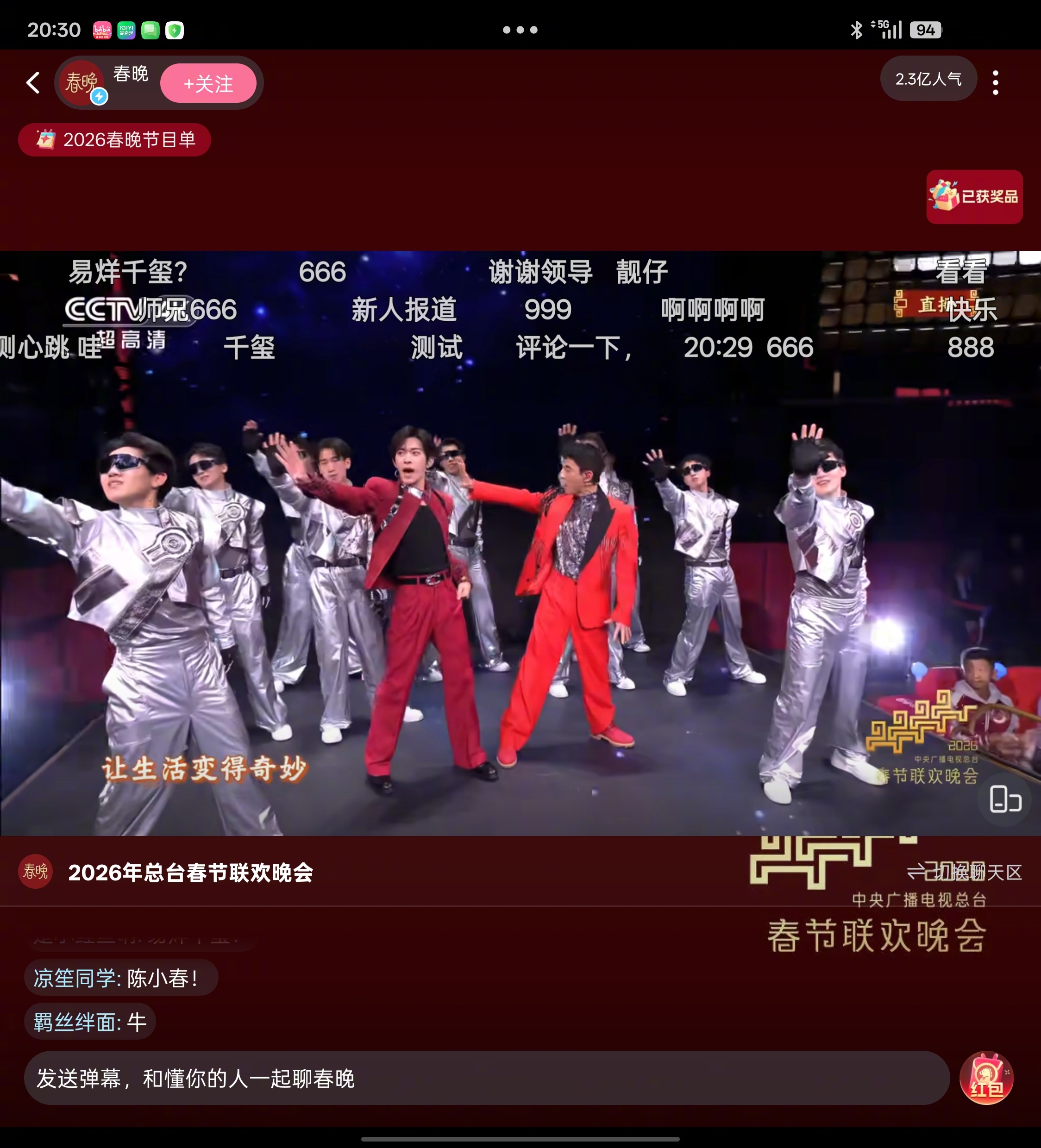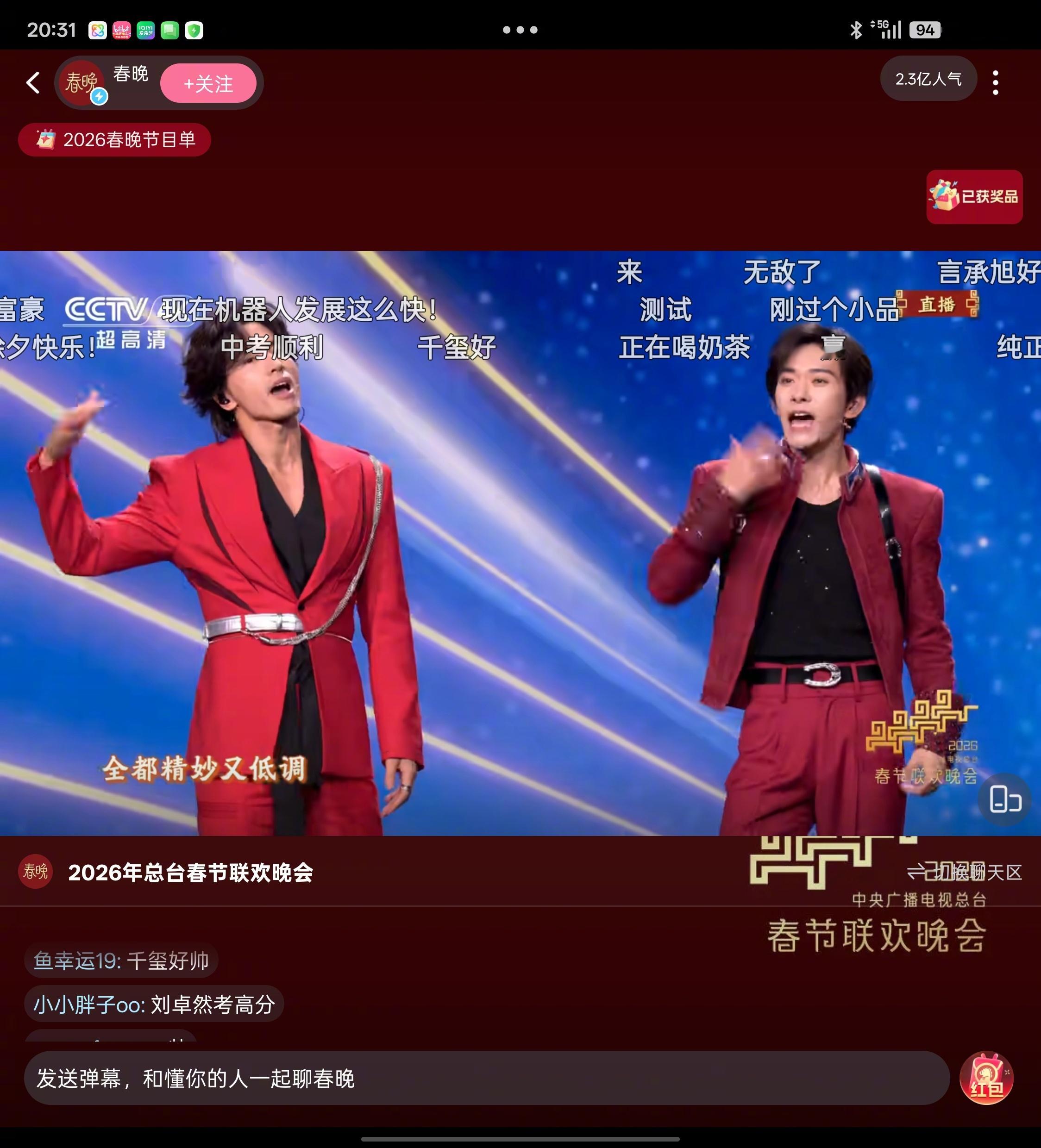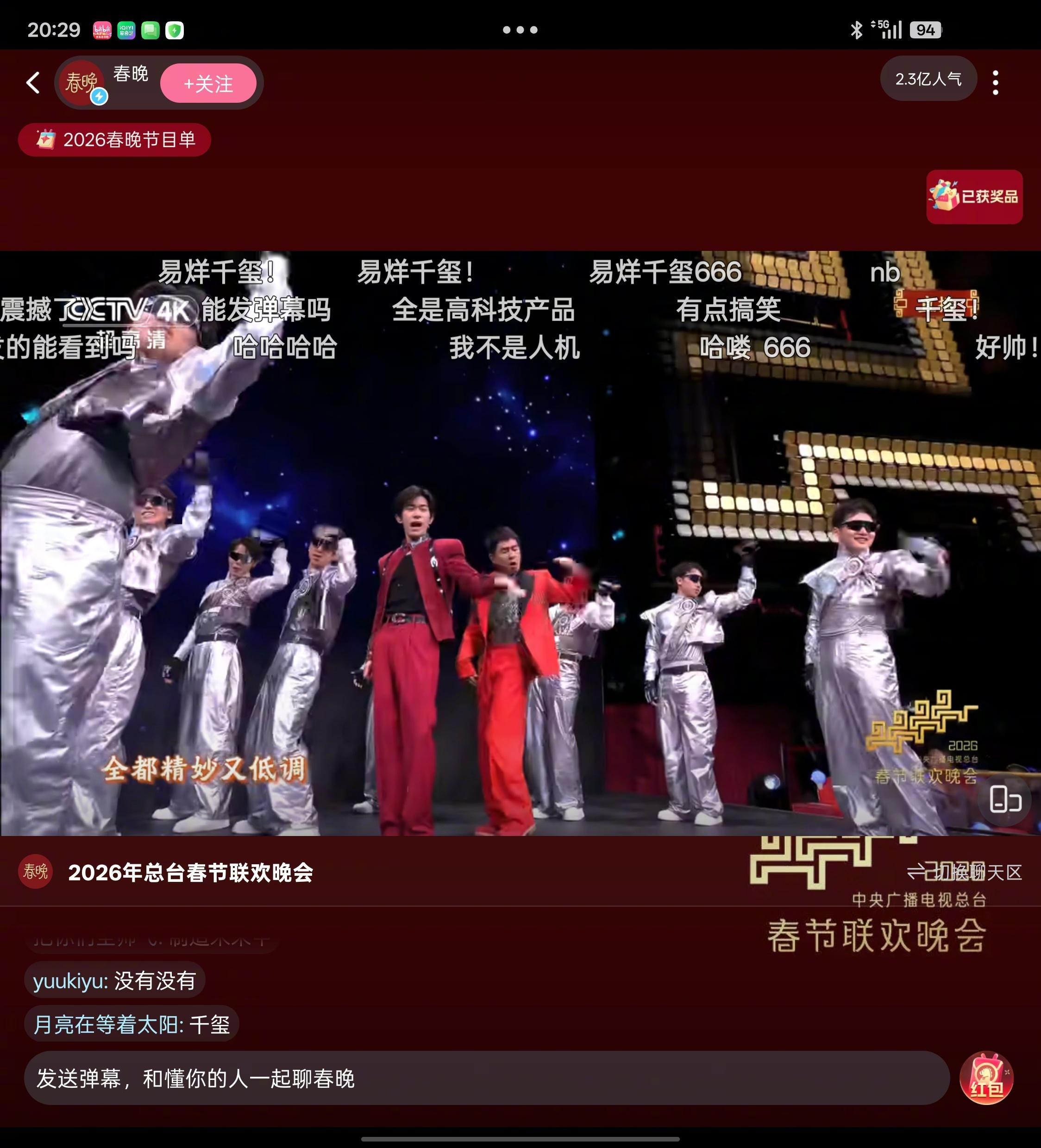 易烊千玺压得住场 啊啊啊啊,易烊千玺一出场,弹幕好帅就刷屏了,还下舞台贴近观众,今年春晚舞台太会了!春晚弹幕