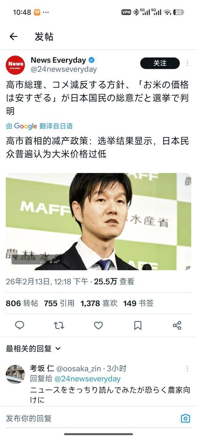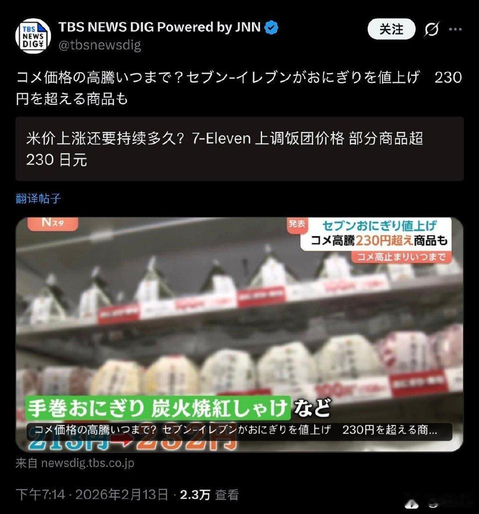 日本人最近破防了,因为便利店的饭团涨价涨得离谱了,关键是价格也不可能掉下来,更可恶的是日本的官员居然幸灾乐祸地说日本人喜迎米价上涨。 其实大家都很难相信日本这个发达国家的食物还是那么匮乏,明明人均那么高,结果吃米都费劲,又不是百年前那种低级生产力,结果一个米价都控制不住,就这样还去给自己的美国爸爸上贡苟活维持那自欺欺人赢下去的所谓日本尊严。