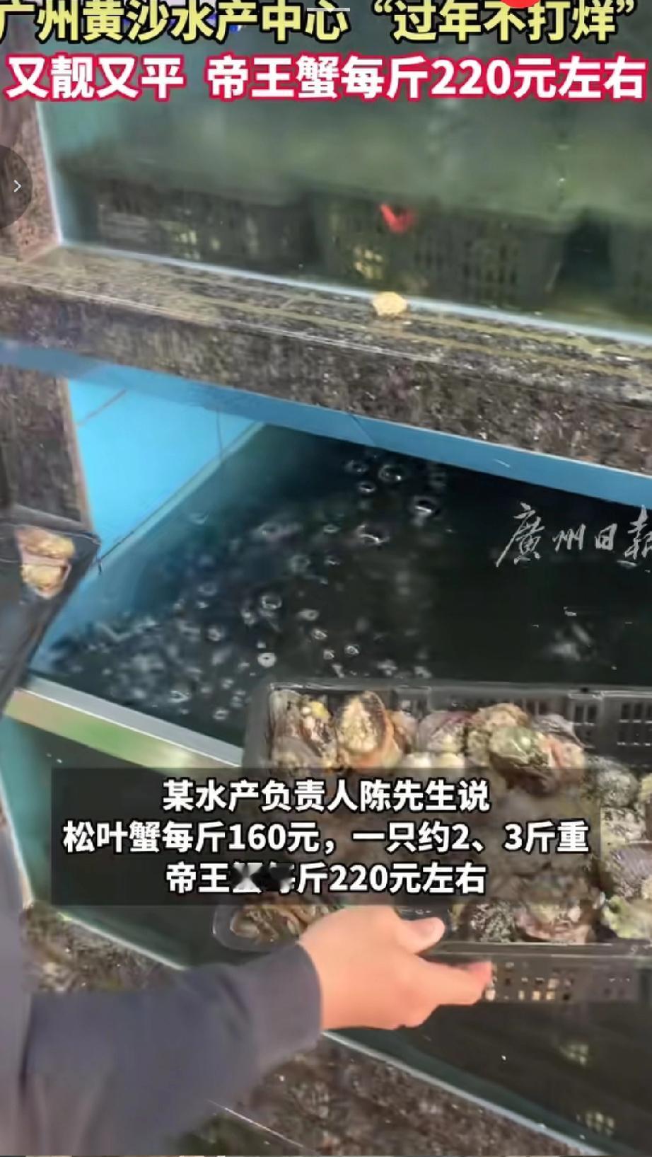 广州黄沙水产中心2026年春节,该市场依旧全年全天候营业、过年不打烊,帝王蟹作为热门海鲜,不仅货源充足、价格实惠,还迎来销售热潮,鲜活帝王蟹批发价约160-170元/斤,5斤重的帝王蟹800-900元即可拿下,相较此前价格有所下降,市场升级后运营成本降低是价格亲民的重要原因。(来源于@广州日报)
