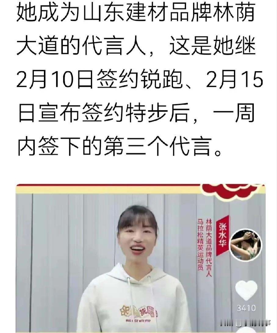 张水华简直“杀疯了”! 除夕还在疯狂签约,昨天刚签特步,今天又拿下山东建材品牌林荫大道,商业价值一路狂飙! 她辞掉工作全职跑马,没有退路,硬是靠一股韧劲拼出一片天。网友都说她是中国最坚强的女性,不屈不挠,越努力越幸运。还有人调侃,得感谢当初的黑子,越网暴她名气越大,支持她的人越多。 是金子总会发光,张水华用实力证明:努力奋斗的人,就该被掌声和机会狠狠偏爱!