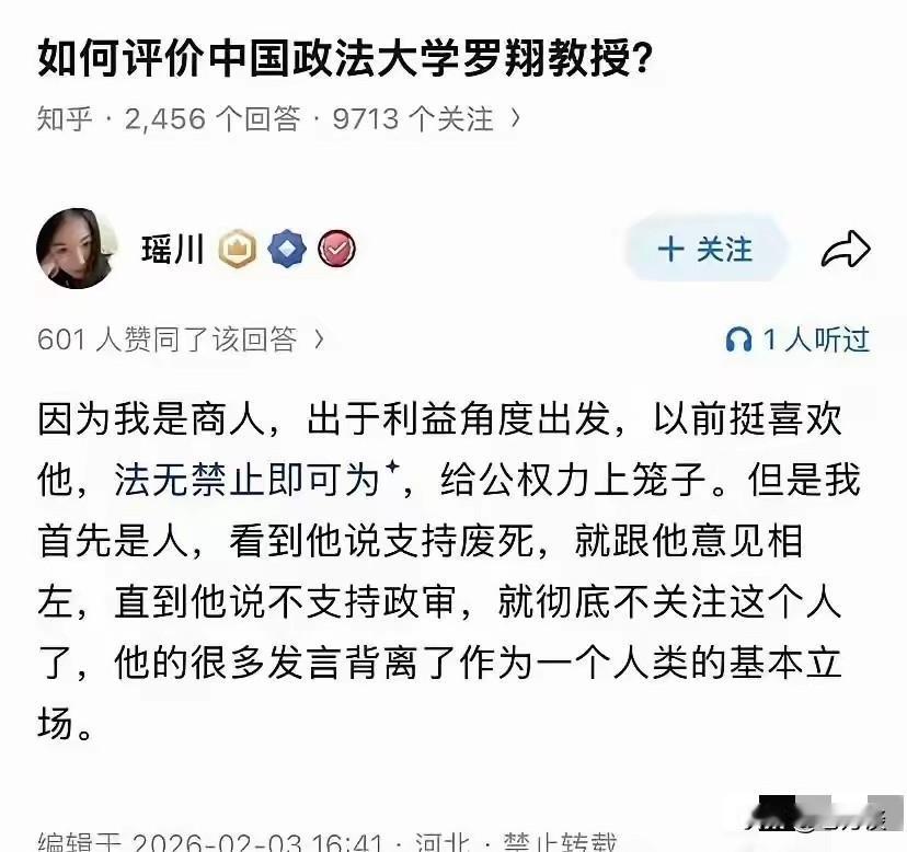 网友对罗翔老师的评价,本来对于他禁止公权力蛮感兴趣挺有好感的,但是后来罗老师再次提出废除死刑,提出废除考公政审。对他的好感就一下子全无了,认为罗翔老师的很多发言,背离了作为一个人类的基本立场。这位网友的点评非常的犀利,怪不得最近罗翔老师都退网了,他的很多观点受到了很多人的质疑甚至抨击,所以罗翔老师在网络上很难找到共鸣,最终决定退网。知识分子其实有一个很大的缺陷,总以为自己能够代表大多数人的观点,能够代表人类发展的正确方向,而且总是以一种高高在上怜悯的态度看待世人和行为。