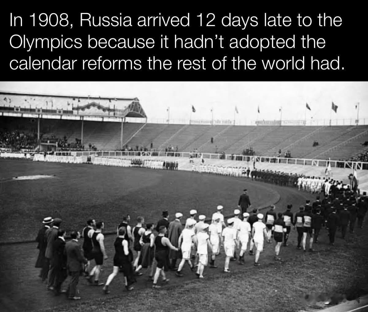 这是一个关于奥运史的著名趣闻,在 1908年伦敦奥运会期间,俄罗斯代表团因为历法不统一的问题迟到了12天。 当时俄罗斯仍在使用儒略历(Julian calendar),而主办国英国及世界大部分地区已经采用了现代的格里高利历(Gregorian calendar,即公历)。 迟到后果: 儒略历比格里高利历慢了整整12天(也有说法是13天)。当俄罗斯射击队抵达伦敦准备参赛时,他们的比赛项目实际上已经结束了。 后续表现: 尽管错过了开幕式和部分早期项目,俄罗斯代表团仍然参加了后续的摔跤和花样滑冰比赛。有趣的是,在那届只有 6 名运动员参赛的情况下,俄罗斯依然凭借出色的表现获得了 1 枚金牌和 2 枚银牌,位列奖牌榜第 12 名。 虽然这被视为一个经典的历史笑话,但现代一些历史学家认为,除了历法因素外,当时俄罗斯缺乏官方的奥委会组织以及沟通不畅,也是导致行程安排混乱的原因。 俄罗斯直到 1918 年十月革命后才正式废除儒略历,全面采用公历。